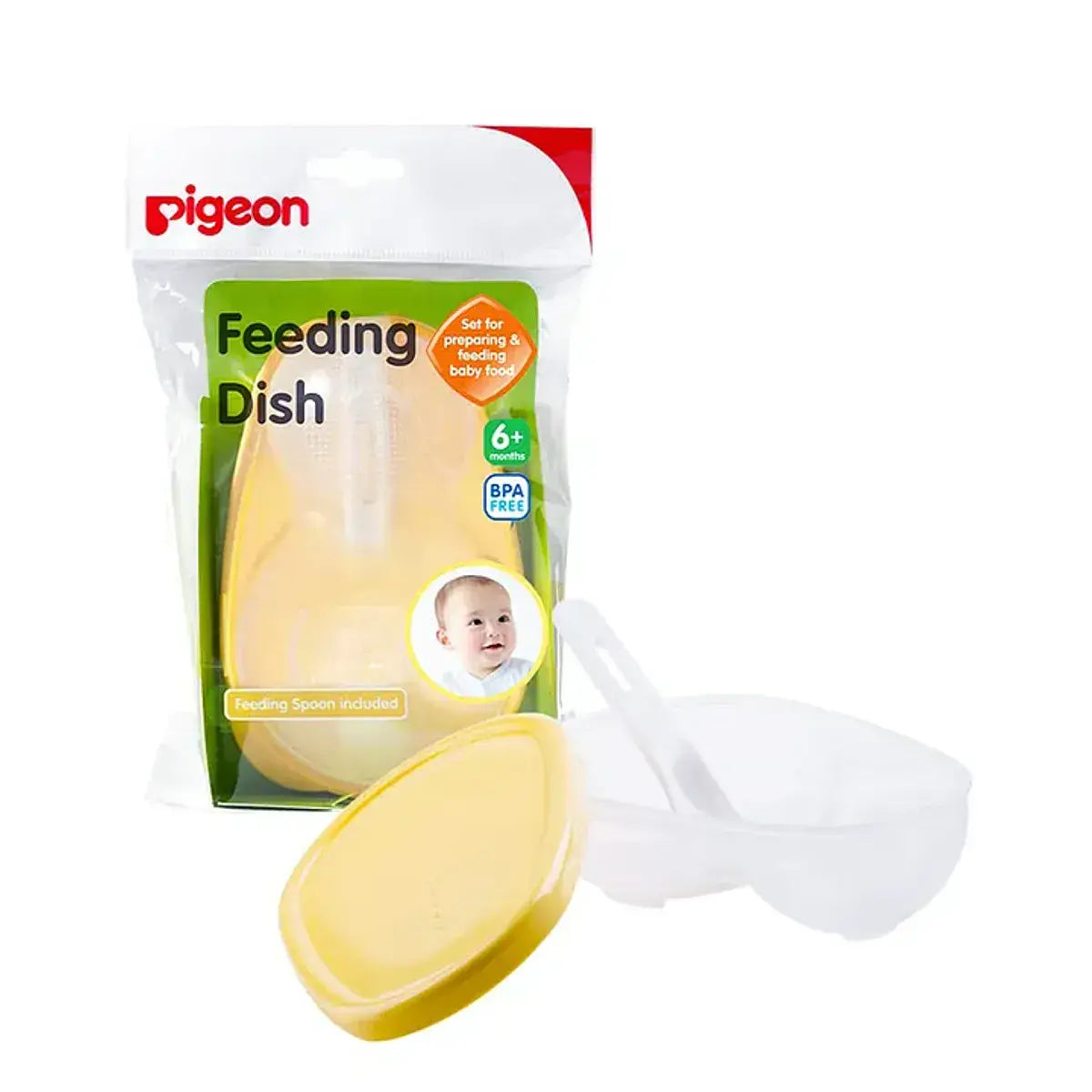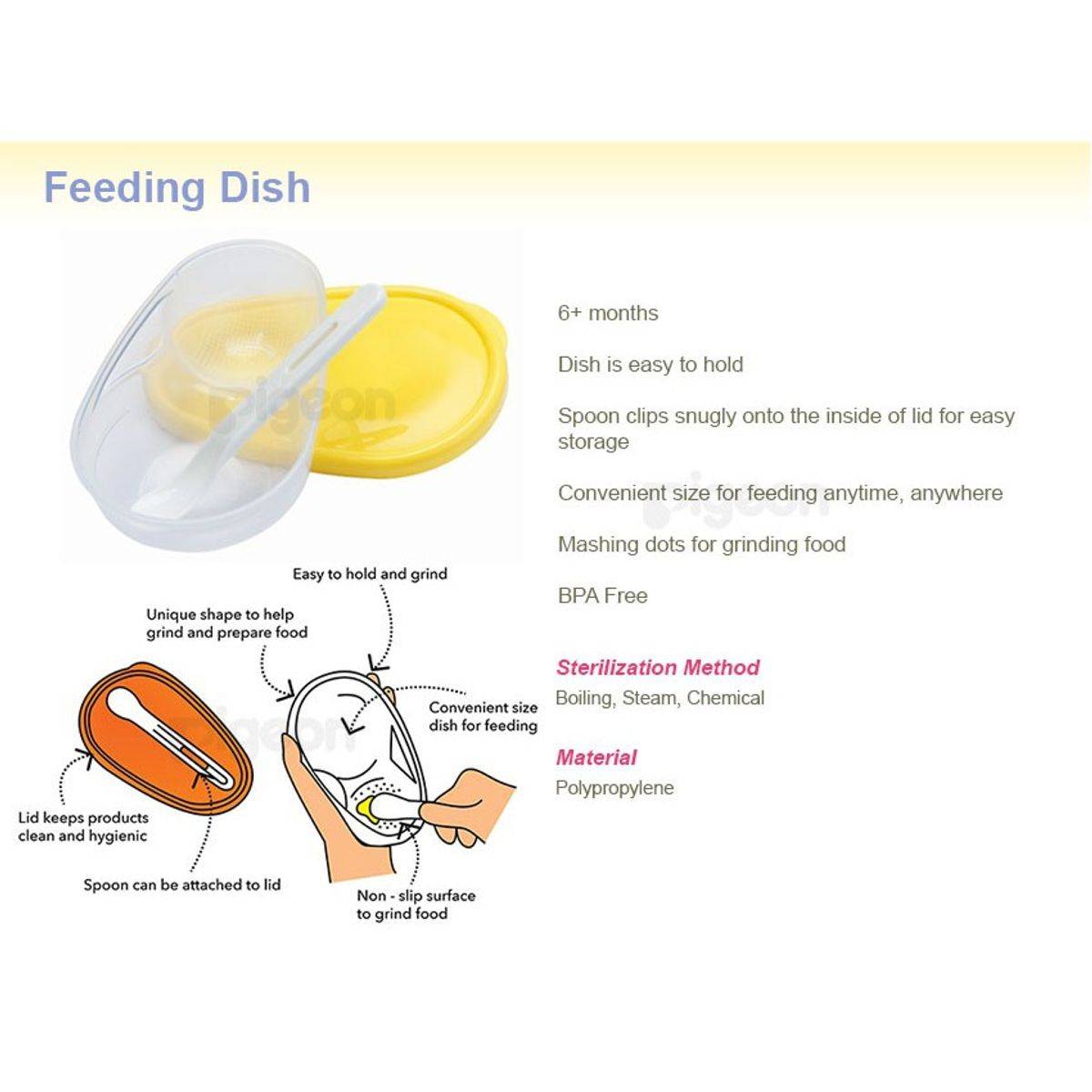 The Pigeon Feeding Dish is designed for babies 6+ months. It features a convenient size for feeding anytime, anywhere, with a spoon that clips snugly onto the lid for easy storage. Made from BPA-free polypropylene, it includes mashing dots for grinding food, ensuring a safe and hygienic feeding experience.
