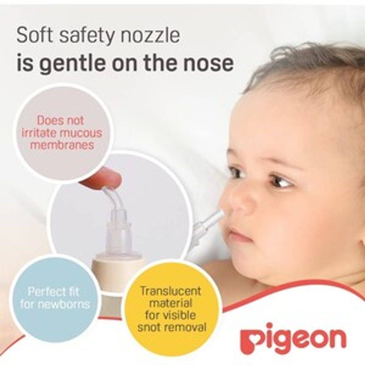Pigeon Nose Cleaner is perfect for cleaning nasal congestion and removing mucus. Soft safety nozzle is gentle on newborns.