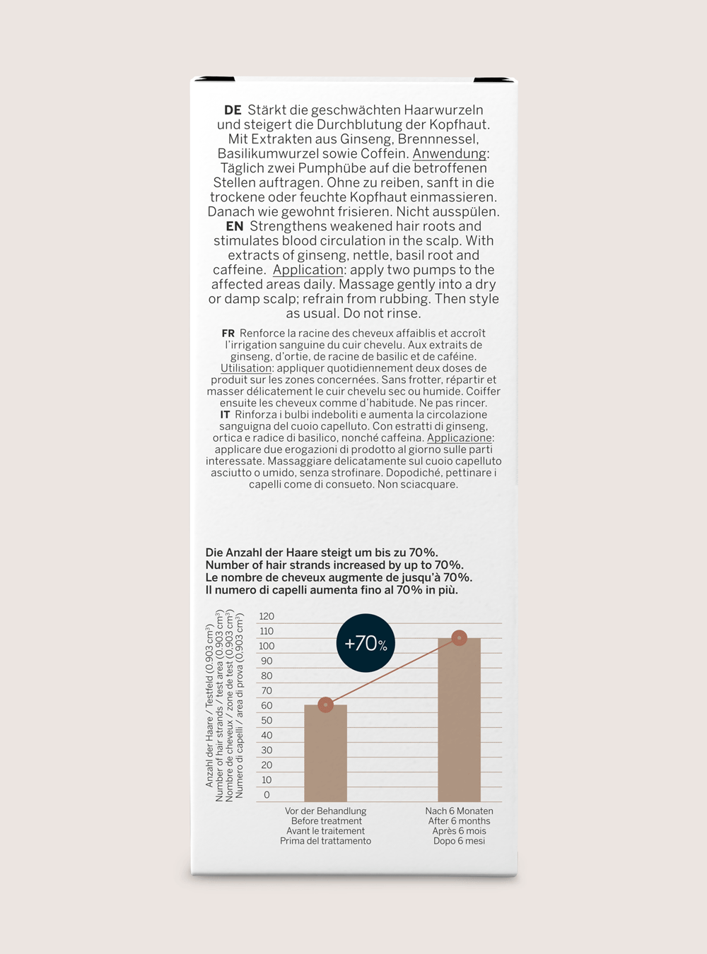 Caffeine, Swiss Nettle Extract, Ginseng Root, Basil Root, Alcohol Denat., Aqua, Glycerin, Urtica Dioica Extract, Urtica Dioica Root Extract, Larix Europaea Wood Extract, Ocimum Basilicum Hairy Root Culture Extract, Camellia Sinensis Leaf Extract, Menthyl Lactate, Glycine, Zinc Chloride, Sodium Metabisulfite, Denatonium Benzoate, Parfum, Ci 47005, Ci 42090, Ci 17200.