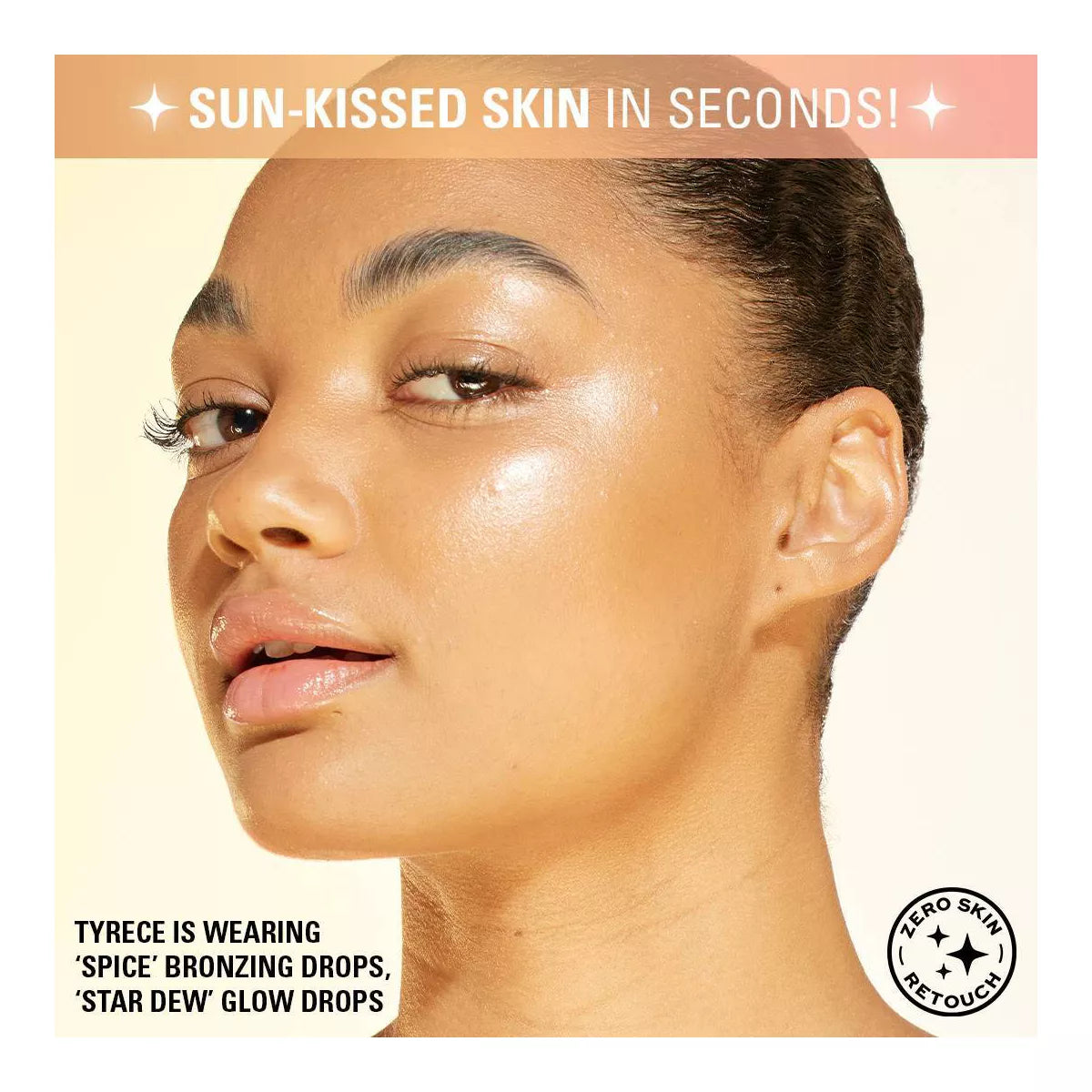 Revolution Makeup Bright Light Glow Drops in Golden Star Dew offer a multi-use formula with squalane, hyaluronic acid, and grapeseed oil to soften and illuminate skin.