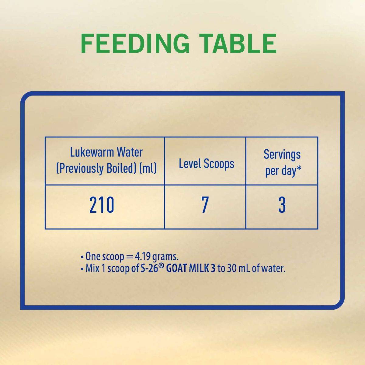 Mix 1 scoop of S-26 Goat Milk 3 to 30 ml of water. Stir until powder completely dissolves. Consume within 1 hour.