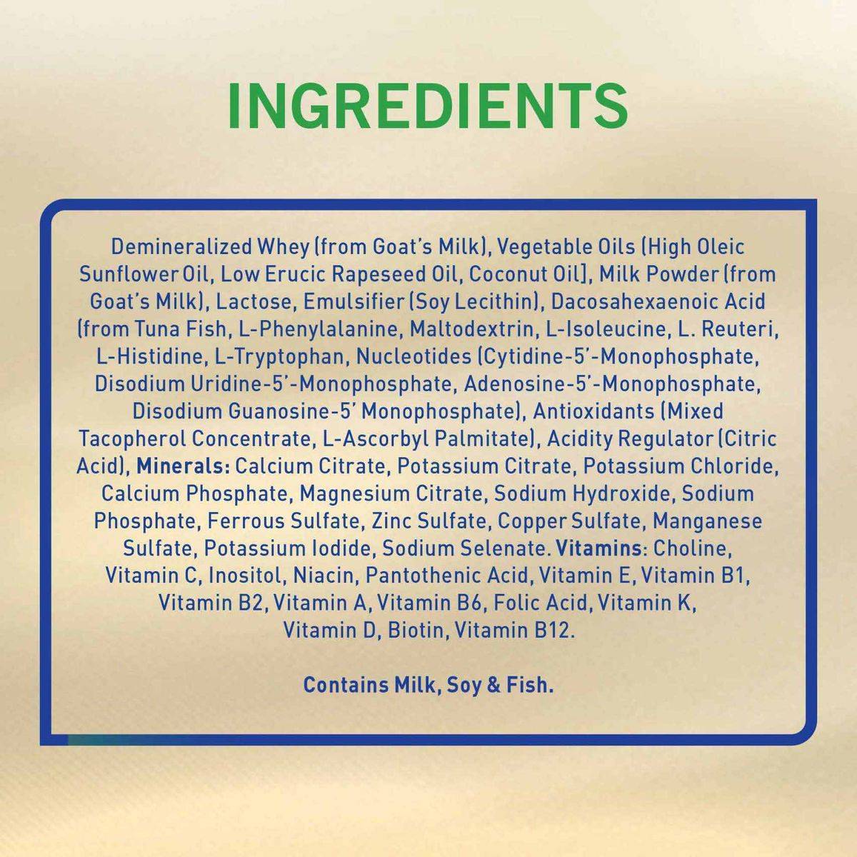 Demineralized Whey (from Goat's Milk), Vegetable Oils (High Oleic Sunflower Oil, Low Erucic Rapeseed Oil, Coconut Oil), Milk Powder (from Goat's Milk), Lactose, Emulsifier (Soy Lecithin), Dacosahexaenoic Acid (from Tuna Fish), L-Phenylalanine, Maltodextrin, L-Isoleucine, L-Reuteri, L-Histidine, L-Tryptophan, Nucleotides (Cytidine-5'-Monophosphate, Disodium Uridine-5'-Monophosphate, Adenosine-5'-Monophosphate, Disodium Guanosine-5'-Monophosphate), Antioxidants (Mixed Tocopherol Concentrate, L-Ascorbyl Palmitate), Acidity Regulator (Citric Acid), Minerals: Calcium Citrate, Potassium Citrate, Potassium Chloride, Calcium Phosphate, Magnesium Citrate, Sodium Hydroxide, Sodium Phosphate, Ferrous Sulfate, Zinc Sulfate, Copper Sulfate, Manganese Sulfate, Potassium Iodide, Sodium Selenate. Vitamins: Choline, Vitamin C, Inositol, Niacin, Pantothenic Acid, Vitamin E, Vitamin B1, Vitamin B2, Vitamin A, Vitamin B6, Folic Acid, Vitamin K, Vitamin D, Biotin, Vitamin B12. Contains Milk, Soy & Fish.