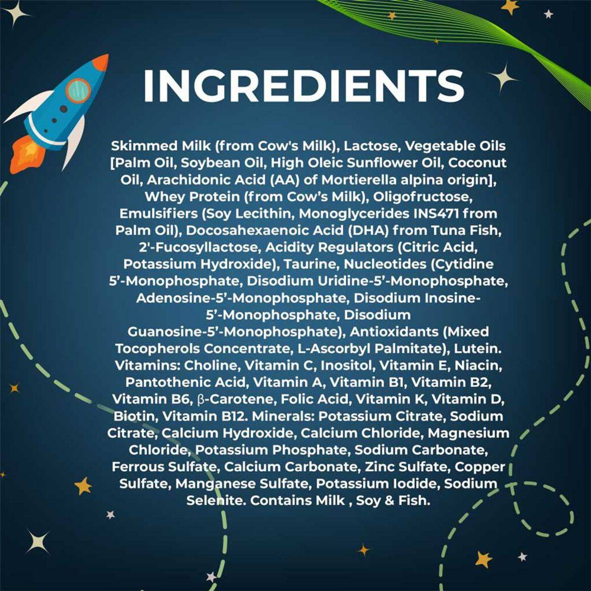 Skimmed Milk, Lactose, Vegetable Oils (Palm Oil, Soybean Oil, High Oleic Sunflower Oil, Coconut Oil), Arachidonic Acid (AA) of Mortierella alpina origin, Whey Protein (from Cow's Milk), Oligofructose, Emulsifiers (Soy Lecithin, Monoglycerides [E471] from Palm Oil), Docosahexaenoic Acid (DHA) from Tuna Oil, Z-Fonylactose, Acidity Regulators (Citric Acid, Potassium Hydroxide), Taurine, Nucleotides (Cytidine-5'-Monophosphate, Disodium Uridine-5'-Monophosphate, Adenosine-5'-Monophosphate, Disodium Inosine-5'-Monophosphate, Disodium Guanosine-5'-Monophosphate), Antioxidants (Mixed Tocopherols Concentrate, L-Ascorbyl Palmitate), Lutein, Vitamins (Choline, Vitamin C, Inositol, Vitamin E, Niacin, Pantothenic Acid, Vitamin A, Vitamin B1, Vitamin B2, Vitamin B6, B-Carotene, Folic Acid, Vitamin K, Vitamin D, Biotin, Vitamin B12), Minerals (Potassium Citrate, Sodium Citrate, Calcium Hydroxide, Calcium Chloride, Magnesium Chloride, Potassium Phosphate, Sodium Carbonate, Ferrous Sulfate, Calcium Carbonate, Zinc Sulfate, Copper Sulfate, Manganese Sulfate, Potassium Iodide, Sodium Selenite). Contains Milk, Soy & Fish.