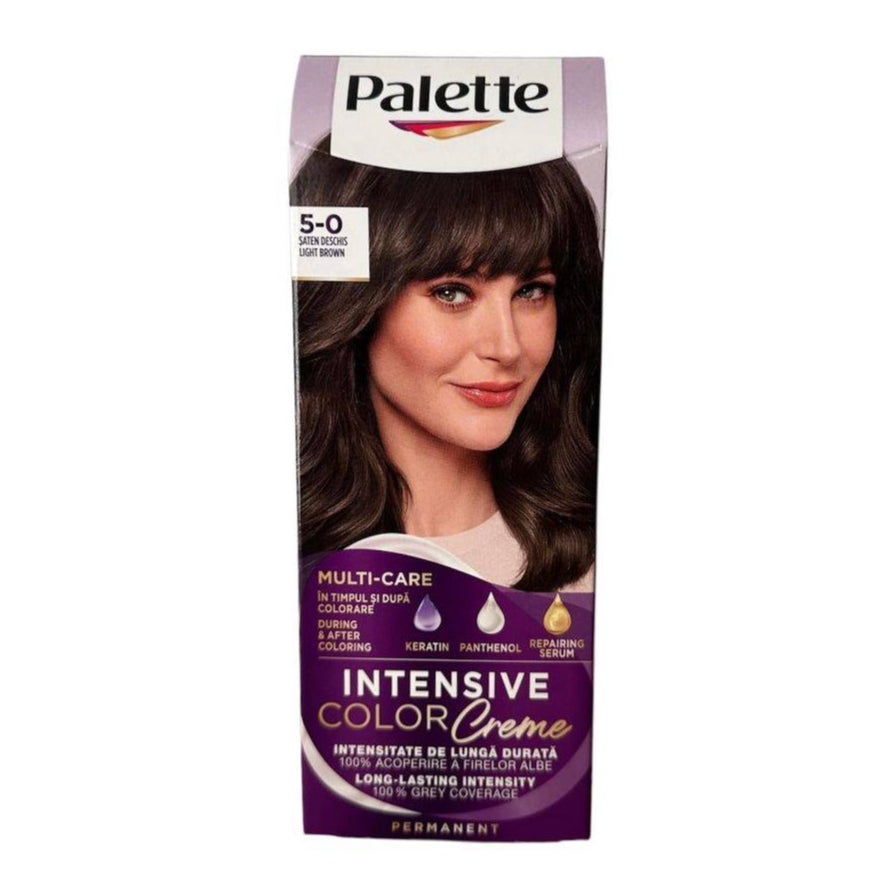 Schwarzkopf Palette Permanent Natural Colors Cream 5-0 Light Brown offers vibrant, long-lasting color with 100% gray coverage. Infused with keratin and panthenol, it nourishes and repairs hair during and after coloring, ensuring a radiant shine.