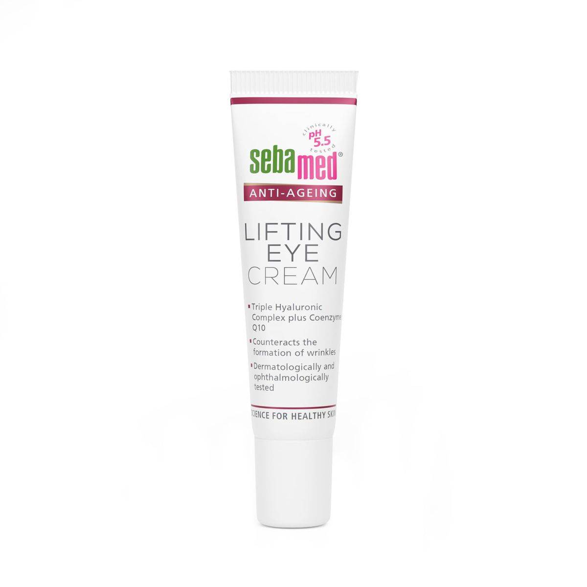 Sebamed Anti Ageing Lifting Eye Cream is formulated with triple hyaluronic acid and coenzyme Q10 to hydrate and reduce wrinkles. Suitable for sensitive skin, it supports the skin's natural barrier.