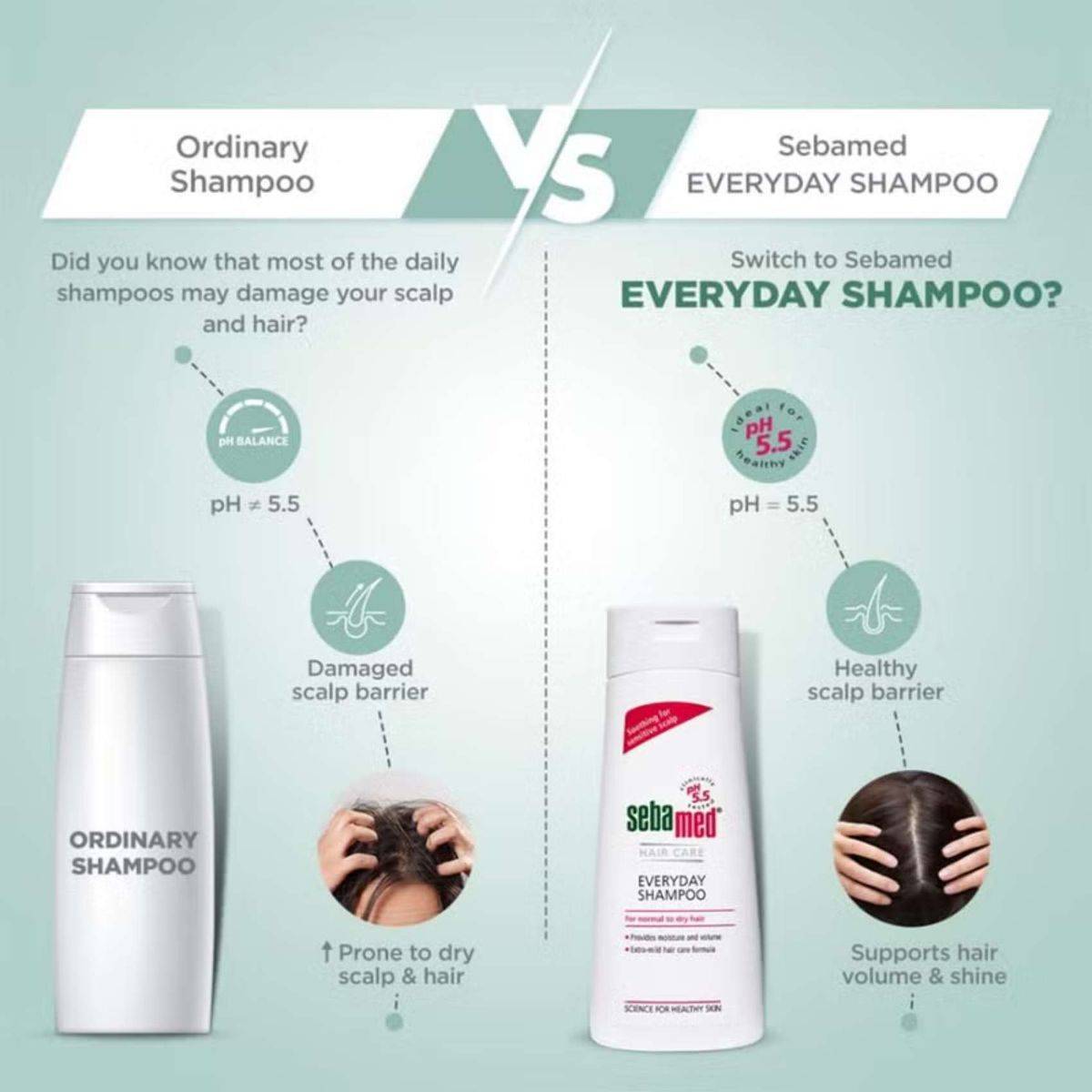 Sebamed Everyday Shampoo is designed for normal to dry hair, providing moisture and volume with an extra-mild formula. It soothes sensitive scalps and maintains the natural pH balance of 5.5, ideal for daily use without drying out the hair or scalp.