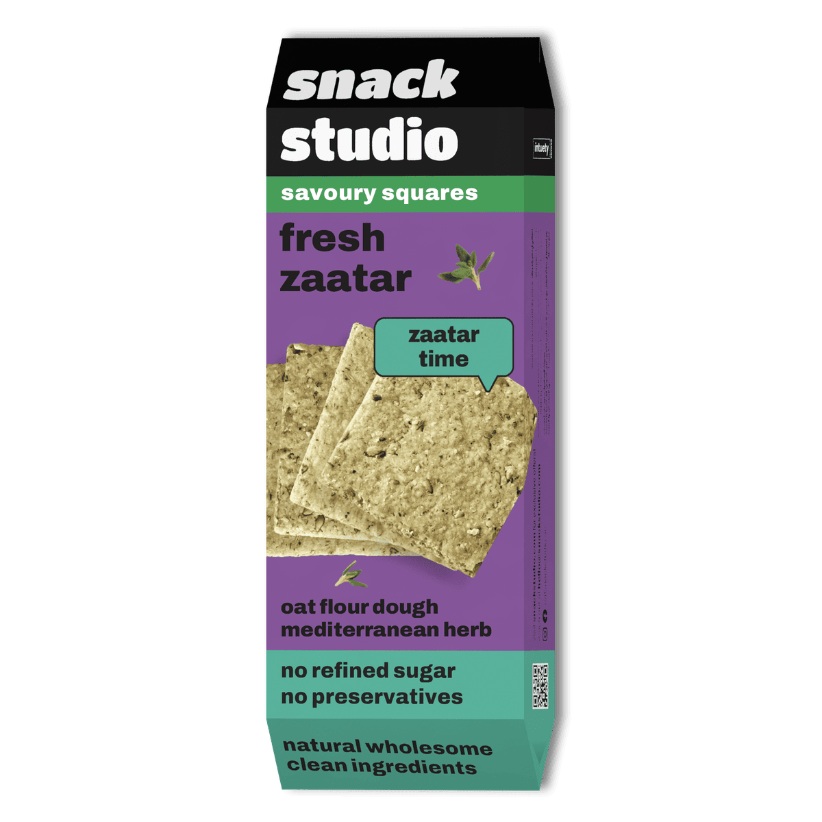 Snack Studio is a snack brand. This product is a Savoury Square, likely a cracker or biscuit, flavored with Fresh Zaatar (a Middle Eastern spice blend).