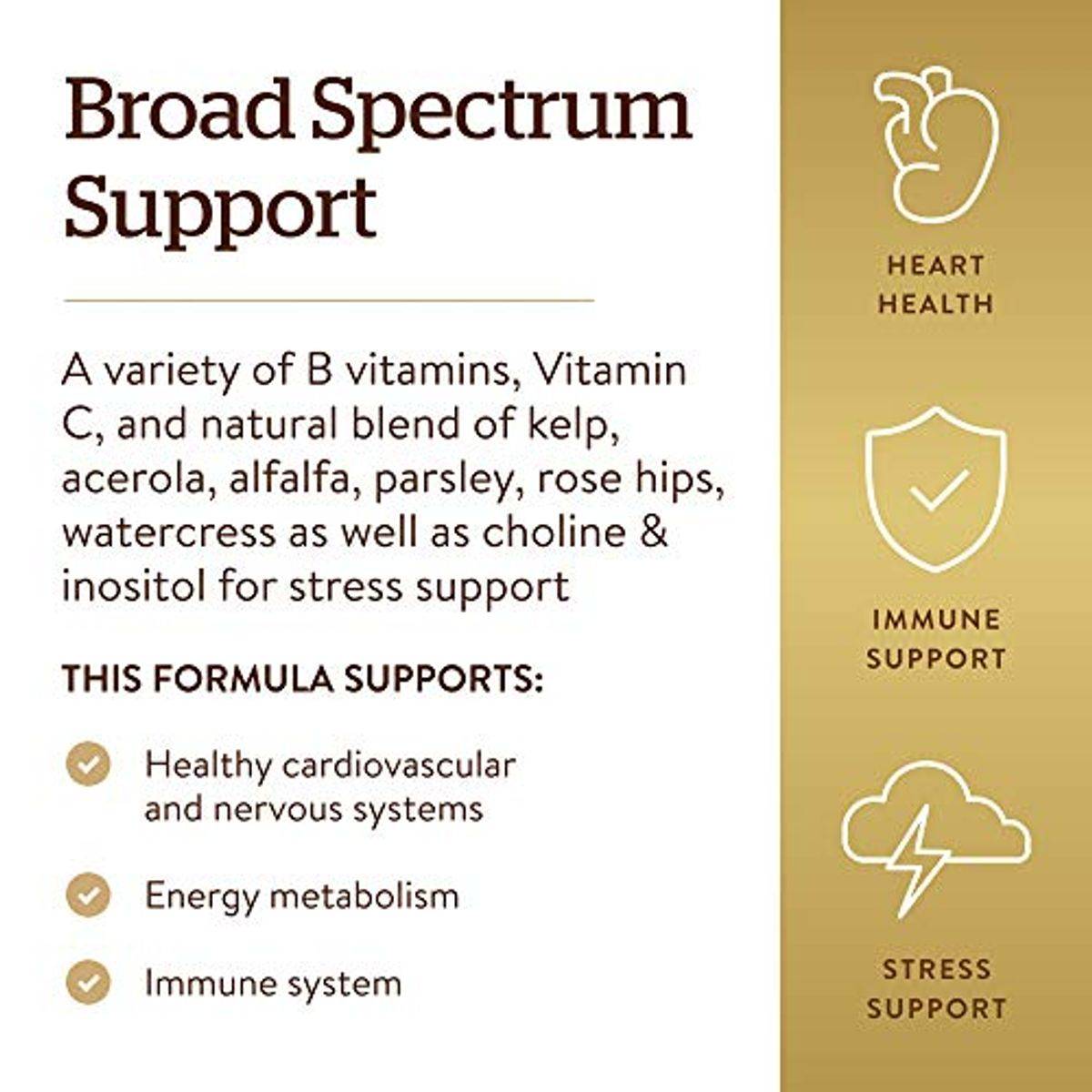 Solgar B Complex with C Stress Formula supports energy metabolism, nervous system, and immune health. Contains B vitamins and Vitamin C, free from gluten, wheat, and dairy. Suitable for vegans.