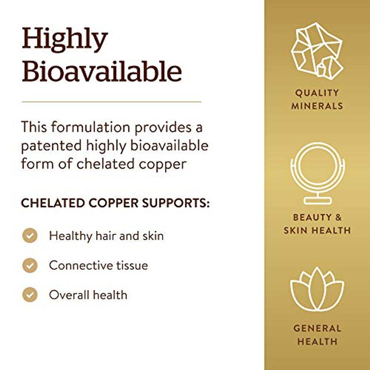 Solgar Chelated Copper provides a highly bioavailable form of copper, essential for collagen formation and supporting connective tissues. This vegan, non-GMO supplement is free from gluten, wheat, and dairy, ensuring quality and purity. Ideal for maintaining healthy skin, bones, and overall health.