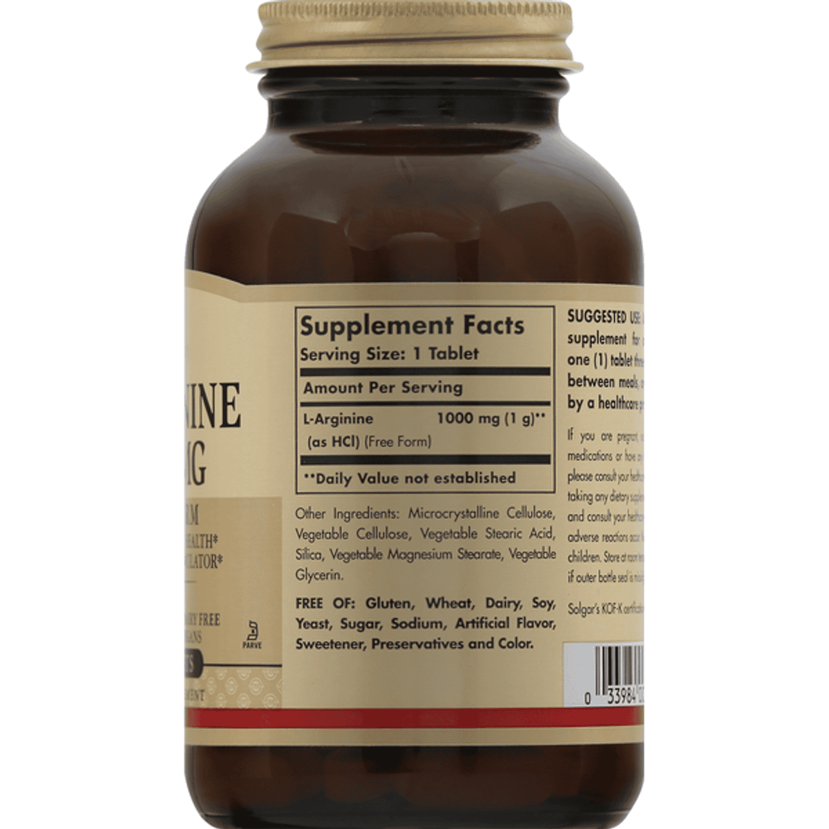 Solgar L-Arginine 1000mg tablets promote heart health by stimulating nitric oxide production. Free from gluten, wheat, dairy, and suitable for vegans.