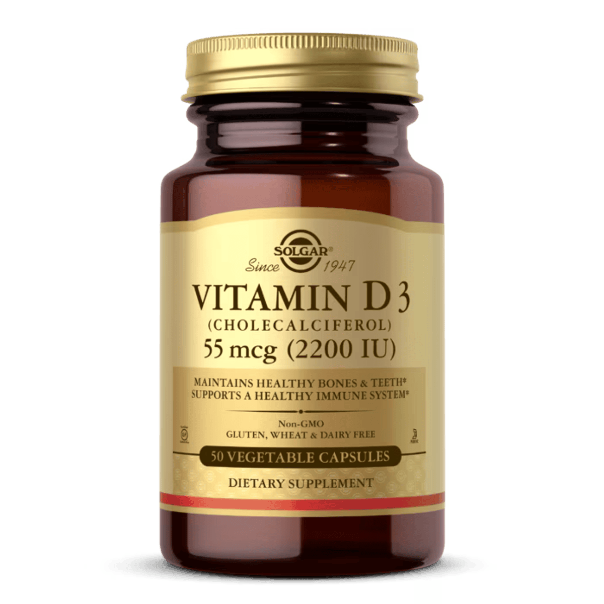Solgar Vitamin D3 2200 IU supports bone and immune health. Non-GMO, gluten, wheat, and dairy-free. Easy-to-swallow vegetable capsules.
