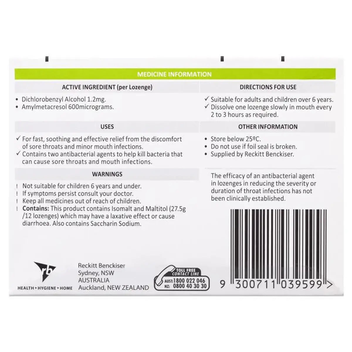 Not suitable for children 6 years and under. If symptoms persist consult your doctor. Keep all medicines out of reach of children. This product contains Isomalt and Maltitol (27.5g/12 lozenges) which may have a laxative effect or cause diarrhoea. Also contains Saccharin Sodium.