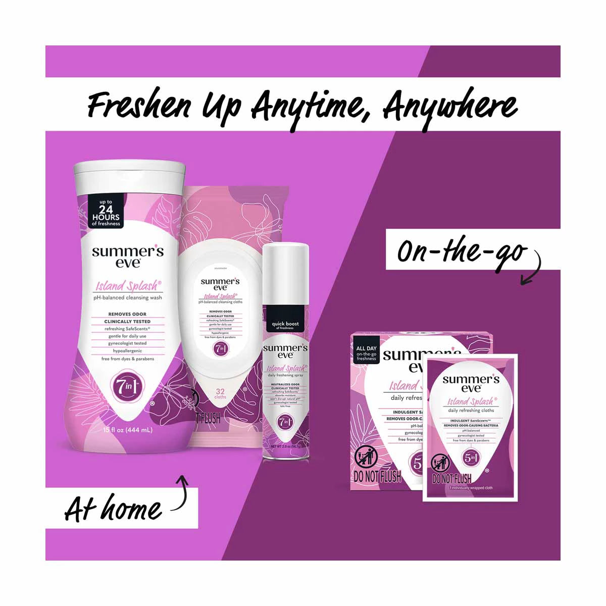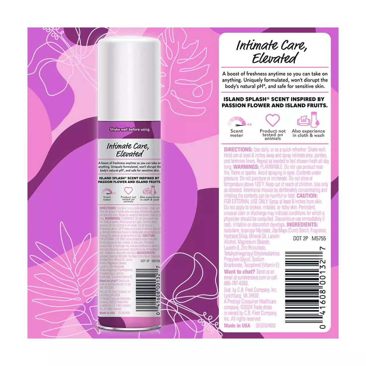 Summer's Eve Island Splash Freshening Spray offers 5 fresh benefits in one spray. Ideal for a quick freshness boost, it neutralizes odor and absorbs moisture. Hypoallergenic and gynecologist-tested, this spray is safe for sensitive skin.