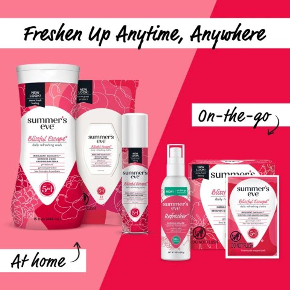 Summer's Eve Blissful Escape Daily Refreshing Cloths are designed to remove odor-causing bacteria while providing a refreshing and cleansing experience for intimate areas. These cloths are pH-balanced, gynecologist tested, and safe for sensitive skin, making them ideal for everyday use.