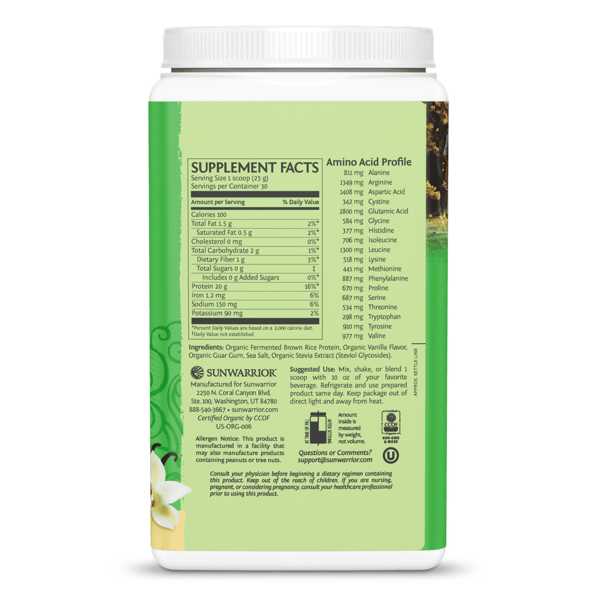 Organic Fermented Brown Rice Protein, Organic Vanilla Flavor, Organic Guar Gum, Sea Salt, Organic Stevia Extract (Steviol Glycosides).