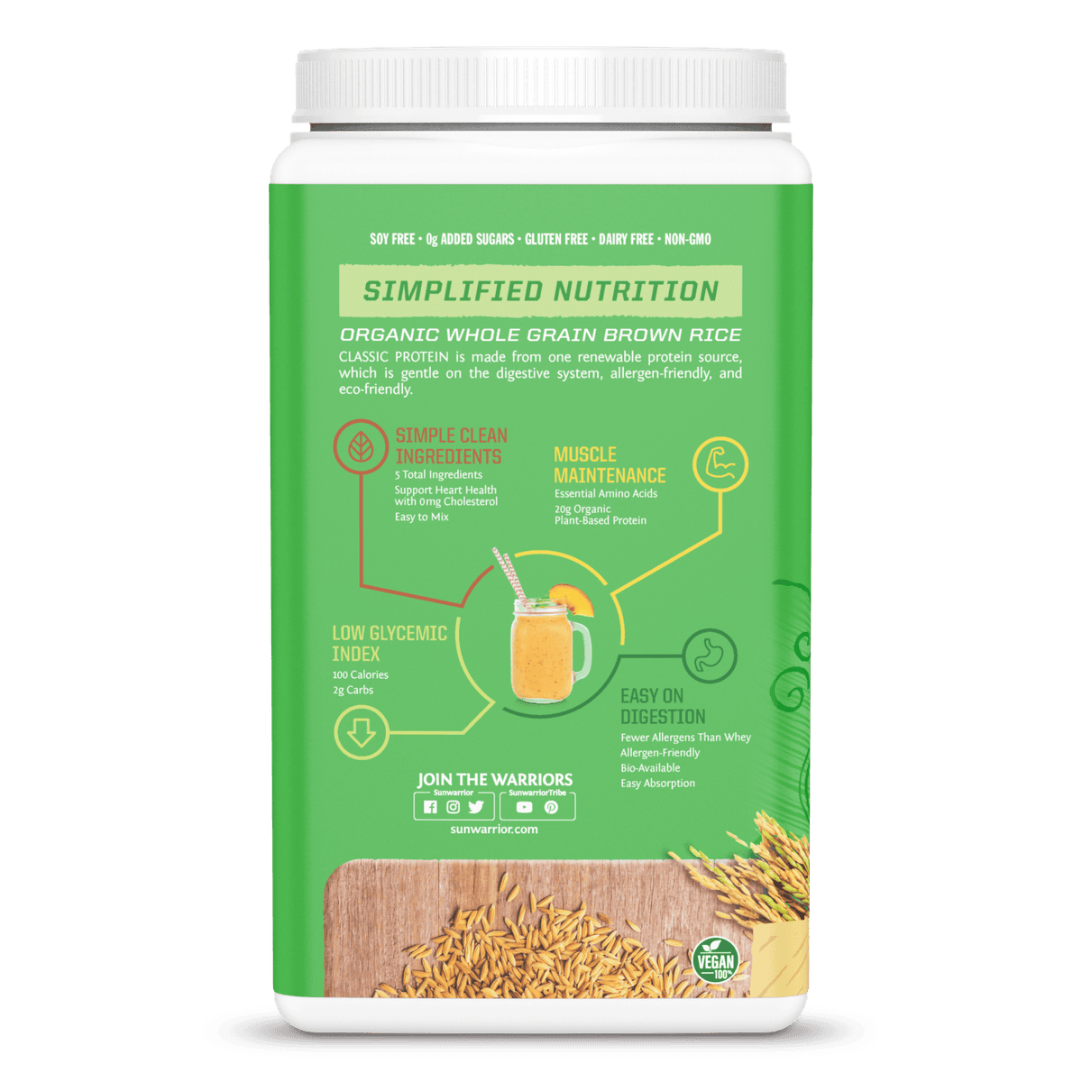 Sun Warrior Classic Protein Organic Vanilla is a plant-based protein powder made from organic whole grain brown rice. It is allergen-friendly and easy on digestion, providing 20g of protein per serving. Ideal for those seeking a clean, vegan protein source.