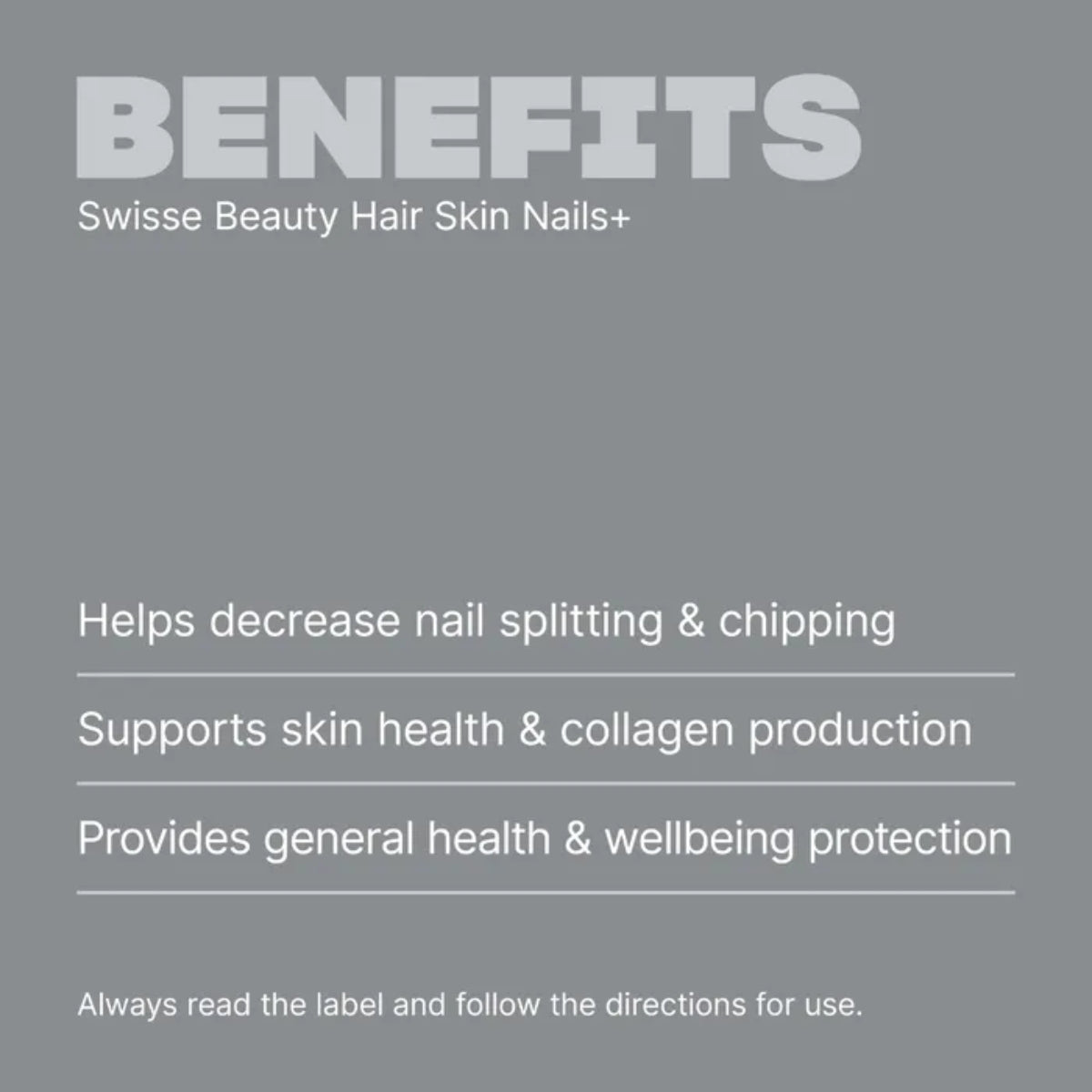 Transform your beauty routine with Swisse Beauty Hair Skin Nails+. One of our beauty bestsellers, this supplement is packed with nutrients like biotin, silica, zinc, and vitamin C. Biotin maintains strong nails, reducing breakage and splitting and supports healthy hair. Silica supports connective tissue health, while vitamin C maintains collagen production, skin firmness and healthy radiant skin. The inclusion of zinc adds extra richness to maintain wound healing and skin health. Every tablet of Swisse Beauty Hair Skin Nails+ is a step towards embracing your beauty from within.