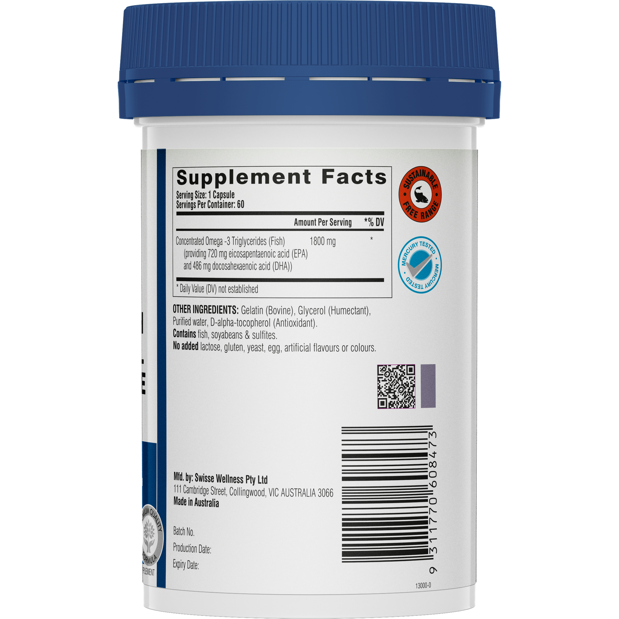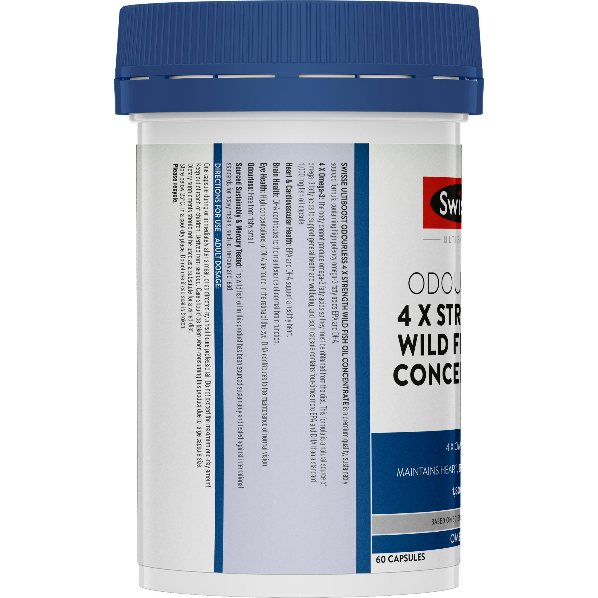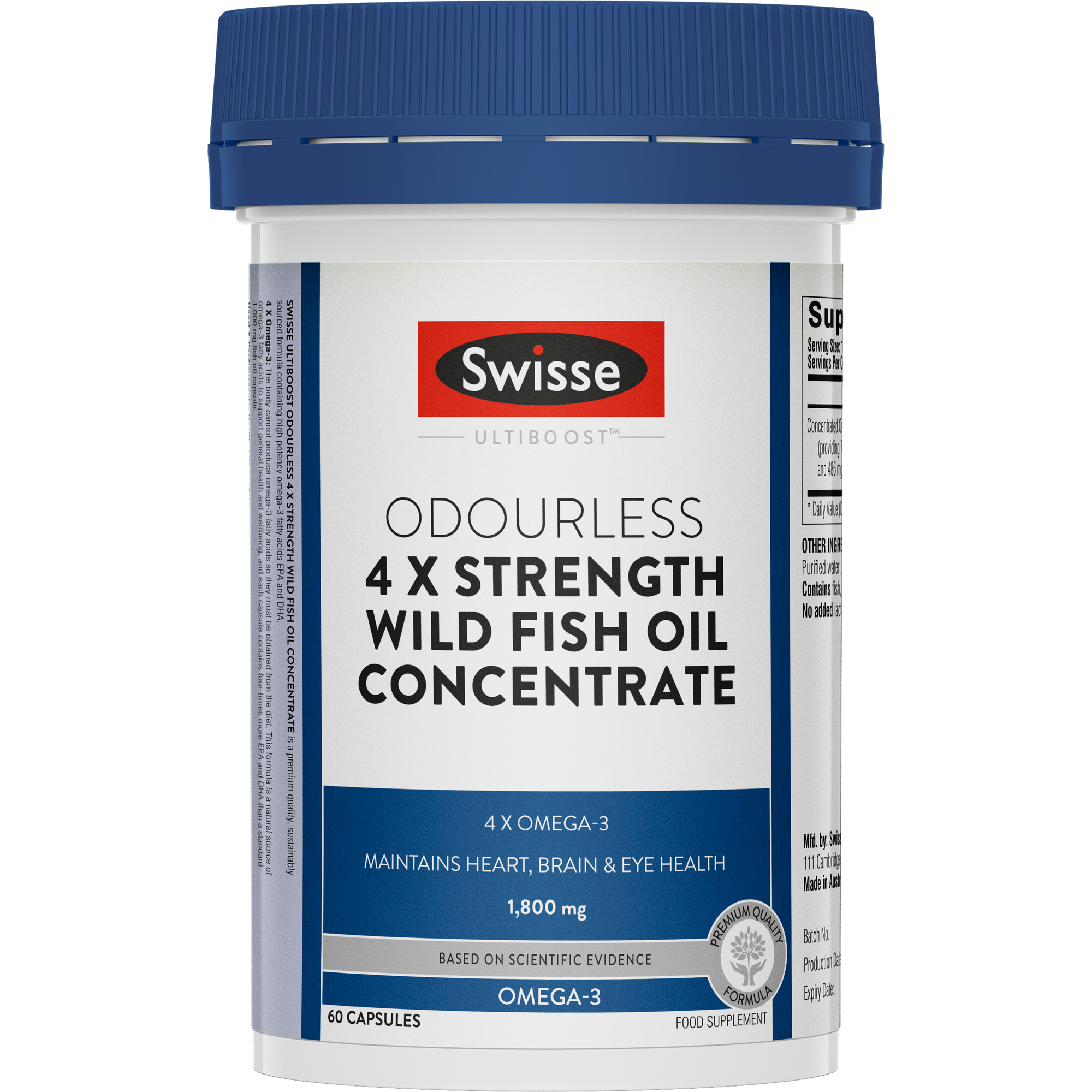 - Swisse Ultiboost Odourless 4x Strength Wild Fish Oil Concentrate 60 Capsules