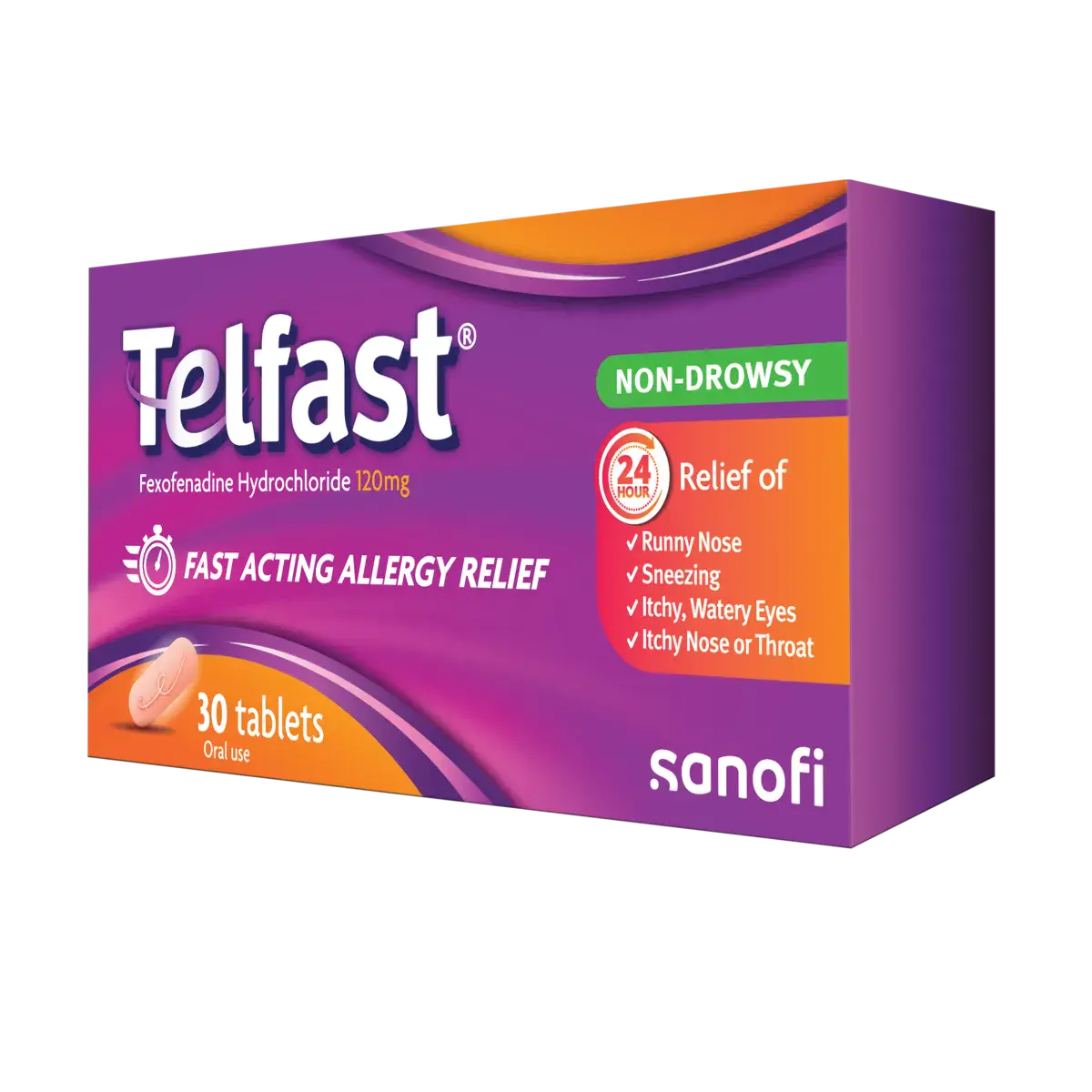 Telfast 120mg tablets provide fast, non-drowsy relief from hayfever symptoms. Contains fexofenadine hydrochloride, effective for adults and children over 12 years. Ideal for managing sneezing, runny nose, and itchy eyes.