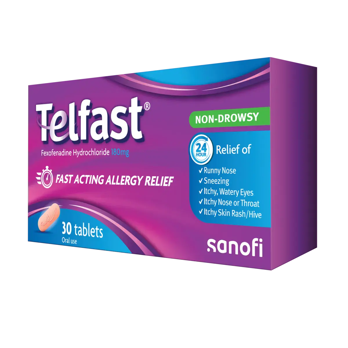 Telfast 180mg Tablets provide fast-acting, non-drowsy relief from hayfever and allergy symptoms. Contains Fexofenadine Hydrochloride, effective within an hour. Suitable for adults and children over 12 years.