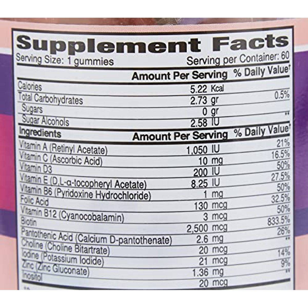 Vitamin A (Retinyl Acetate), Vitamin C (Ascorbic Acid), Vitamin D3, Vitamin E (D,L-tocopheryl Acetate), Vitamin B6 (Pyridoxine Hydrochloride), Folic Acid, Vitamin B12 (Cyanocobalamin), Biotin, Pantothenic Acid (Calcium D-pantothenate), Choline (Choline Bitartrate), Iodine (Potassium Iodide), Zinc (Zinc Gluconate), Inositol, Maltitol, Isomalt, Water, Citrus Pectine, Citric Acid, Sodium Citrate, Natural Strawberry & Coconut Flavor, Spirulina Extract.