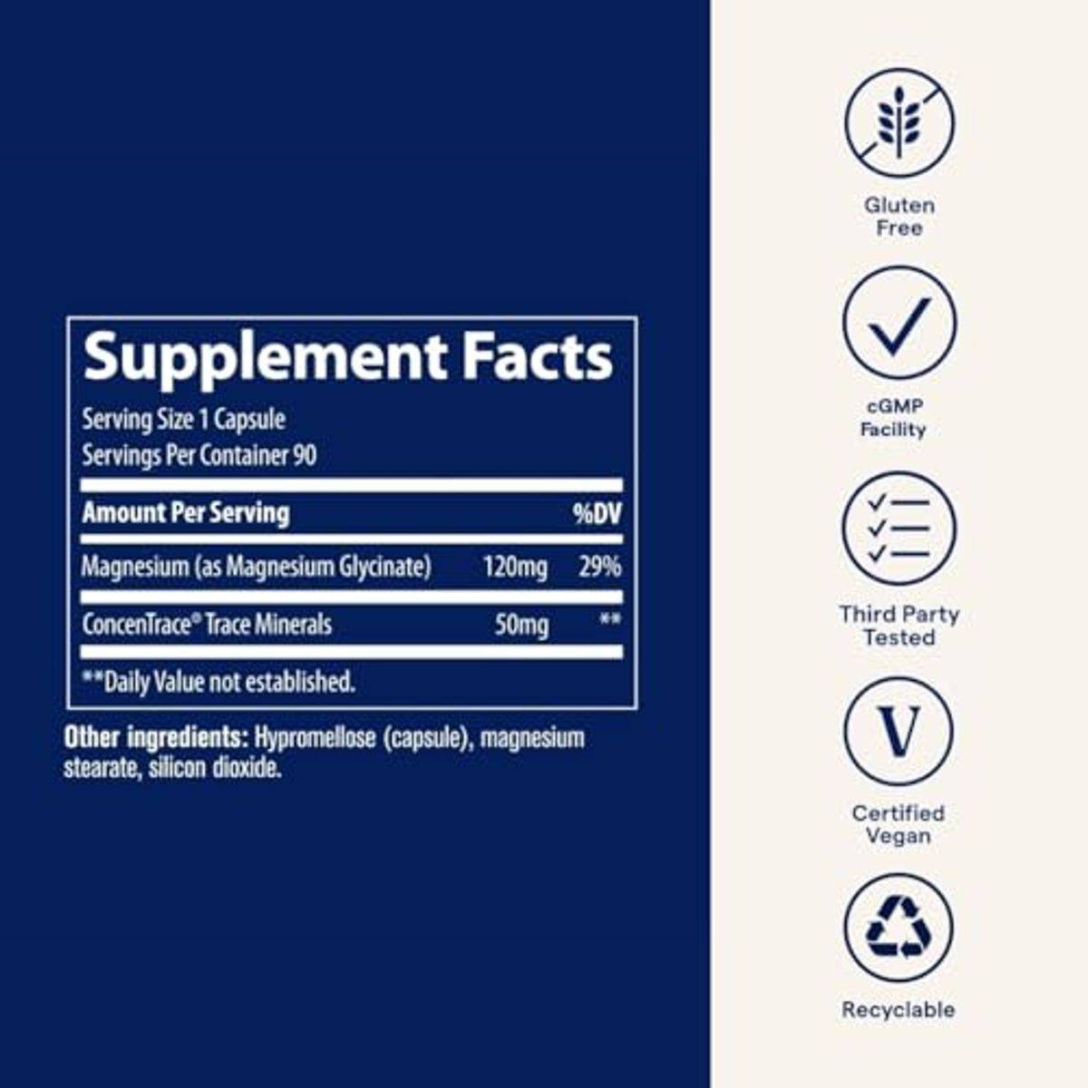 Magnesium Glycinate, ConcenTrace Trace Mineral Complex, Hypromellose (capsule), Magnesium Stearate, Silicon Dioxide.
