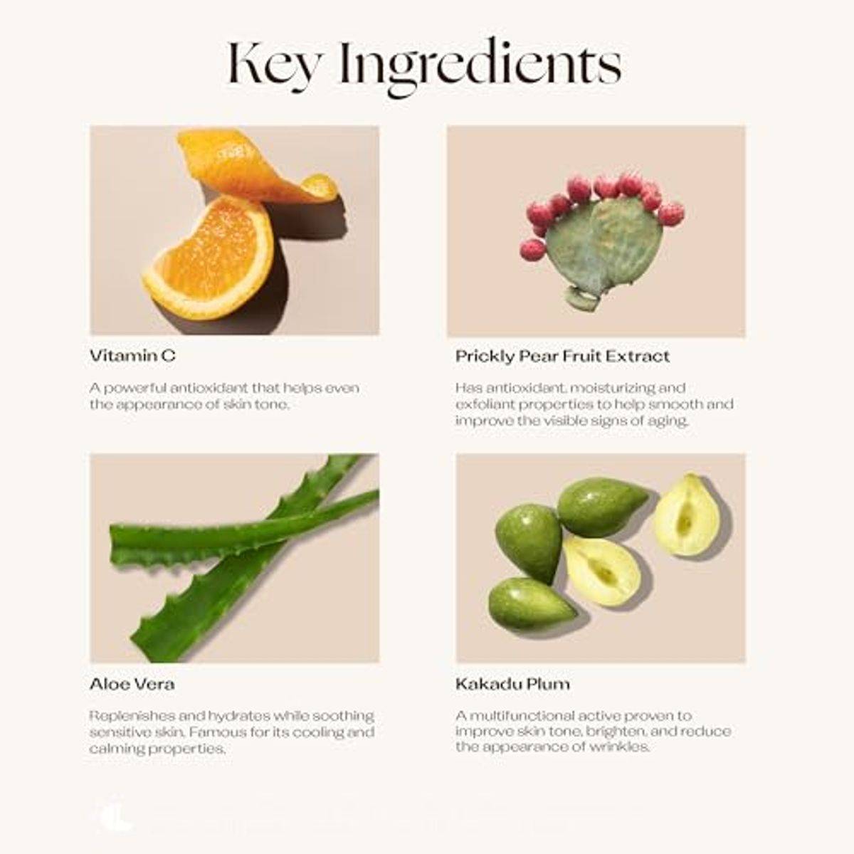 Aqua (water), Aloe Barbadensis (Aloe Vera) Leaf, Glycerin, Vitamin C, Kakadu Plum, Prickly Pear, Mild Plant-Based Cleansers (Decyl, Caprylyl/Capryl, Coco-Glucoside), Citric Acid, Natural Fragrance. Preserved with Benzyl Alcohol & Caprylhydroxamic Acid.