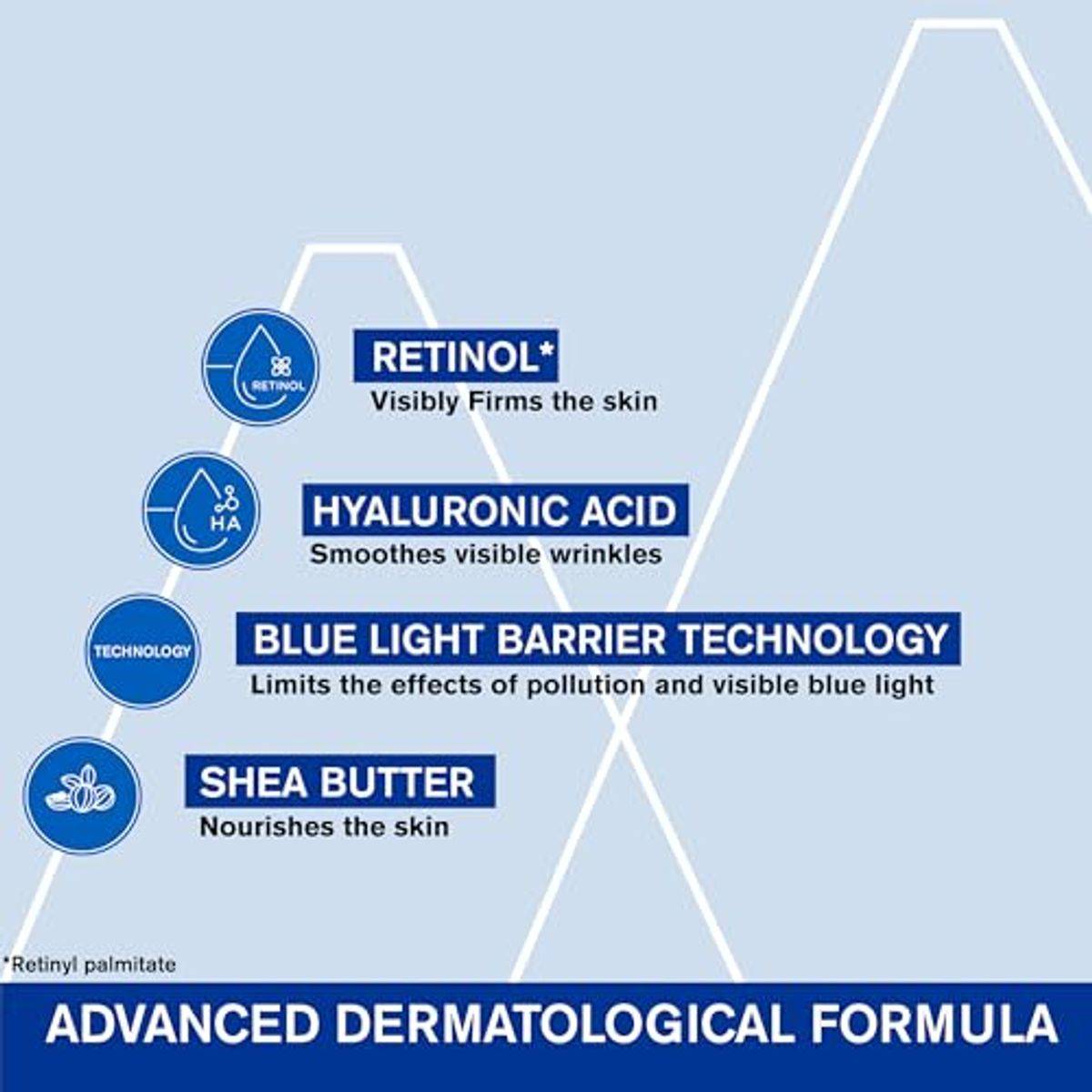 This anti-aging day cream firms and smooths skin with retinol, hyaluronic acid, and shea butter. Protects against blue light and pollution. Suitable for normal to dry, even sensitive skin.