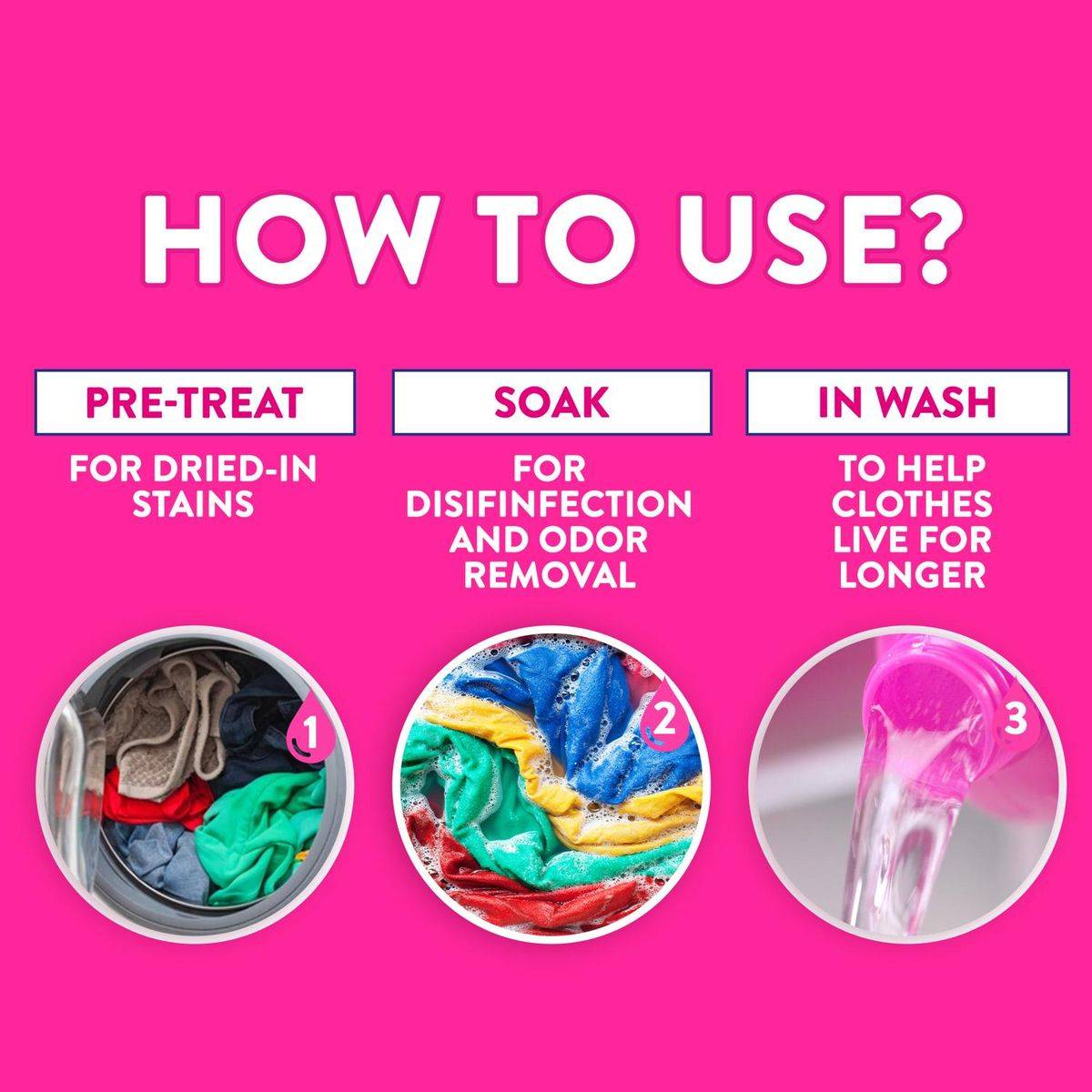 Pre-Treat: Pour directly onto stain. Soaking/Washing: Add the recommended dosage (check pack) to your main wash or presoak solution.