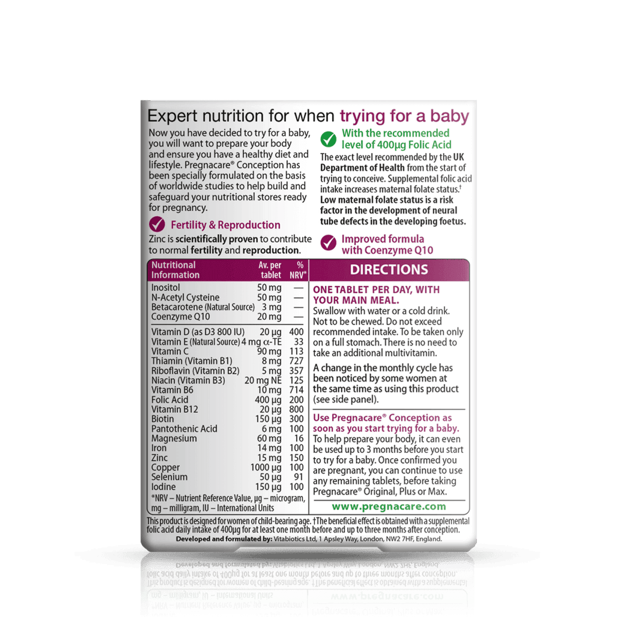 Vitabiotics Pregnacare Conception is specially formulated to support healthy conception. It includes zinc, folic acid, and essential vitamins to aid fertility and reproductive health. Ideal for women trying to conceive, this supplement provides expert nutritional support. UK's No.1 pregnancy supplement brand.