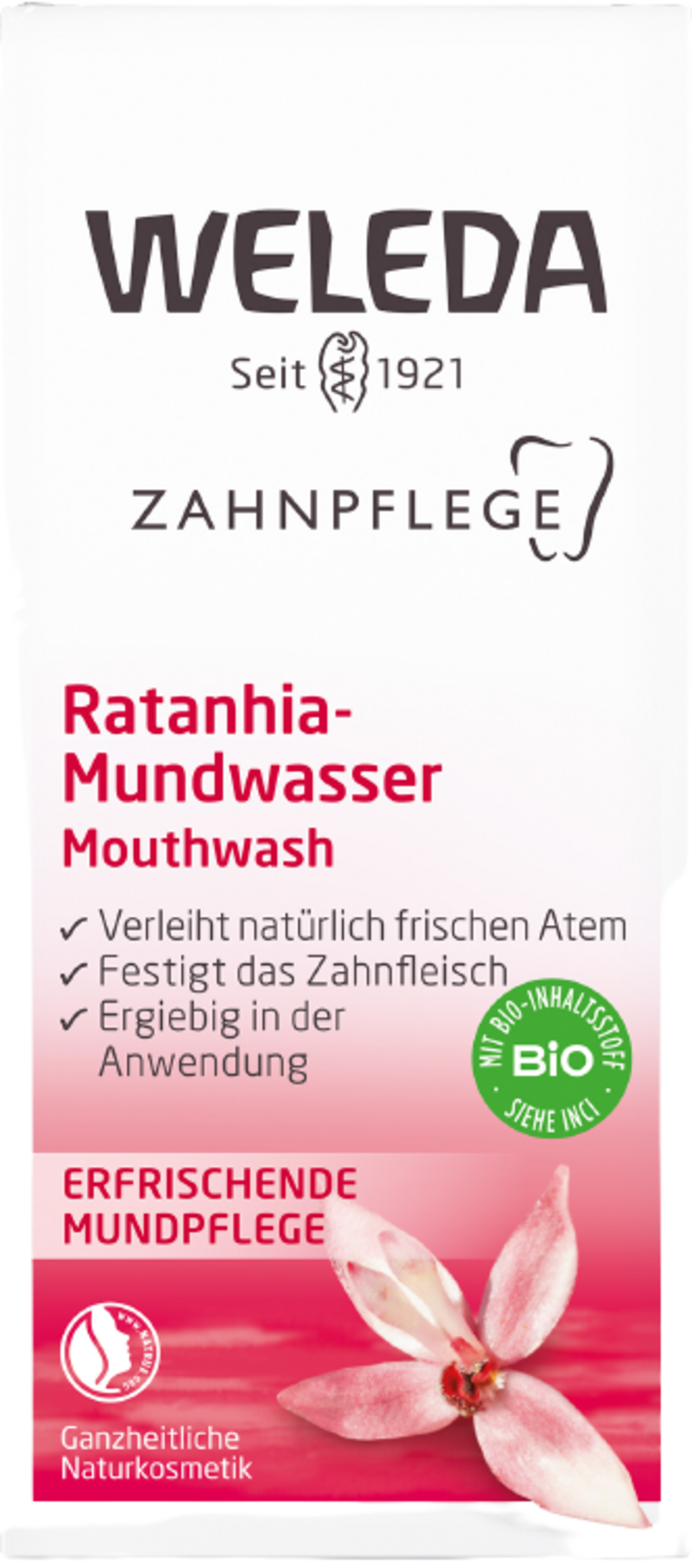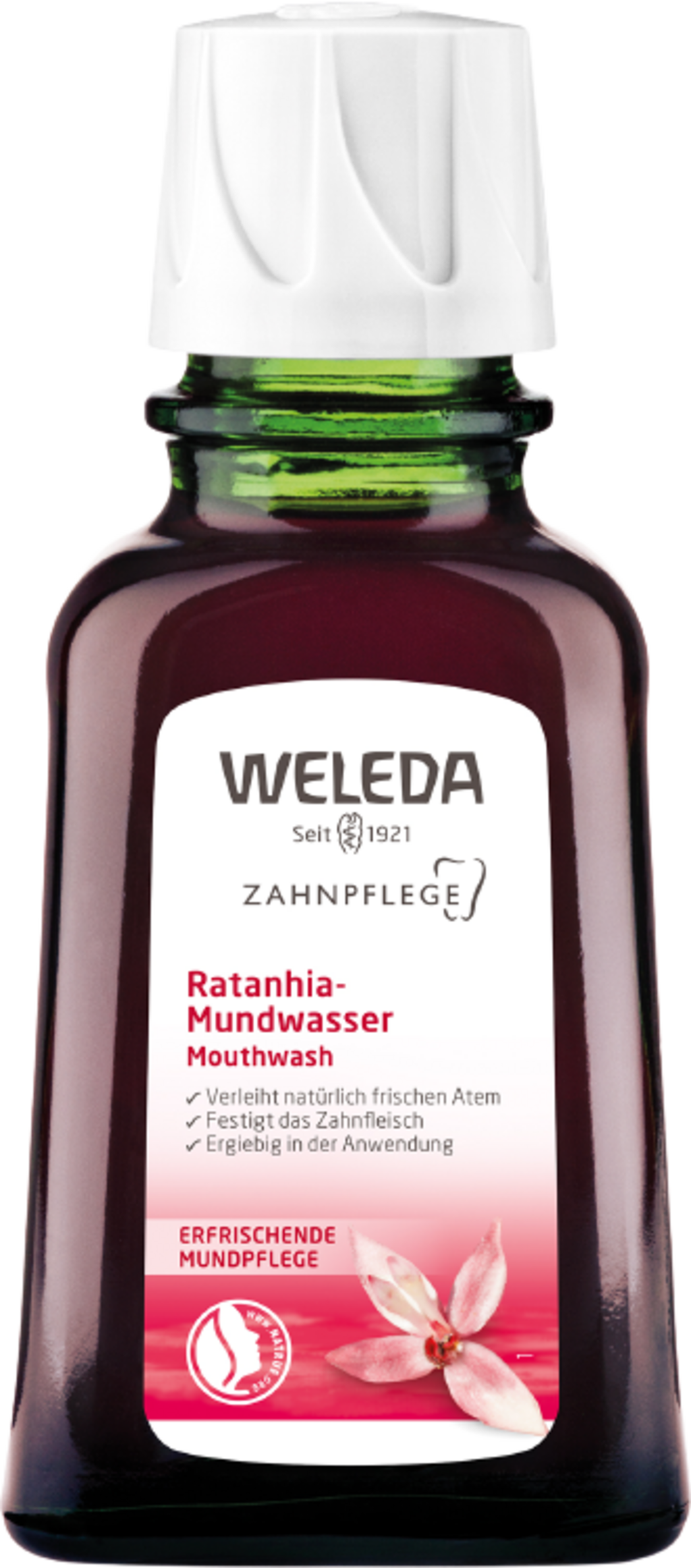 Weleda Ratanhia Mouthwash is a natural dental care solution that refreshes breath and strengthens gums. Made with organic ratanhia roots and myrrh, it tones and tightens gums while essential oils provide lasting freshness. Ideal for daily use, this vegan-friendly mouthwash is NaTrue certified for natural and organic cosmetics.