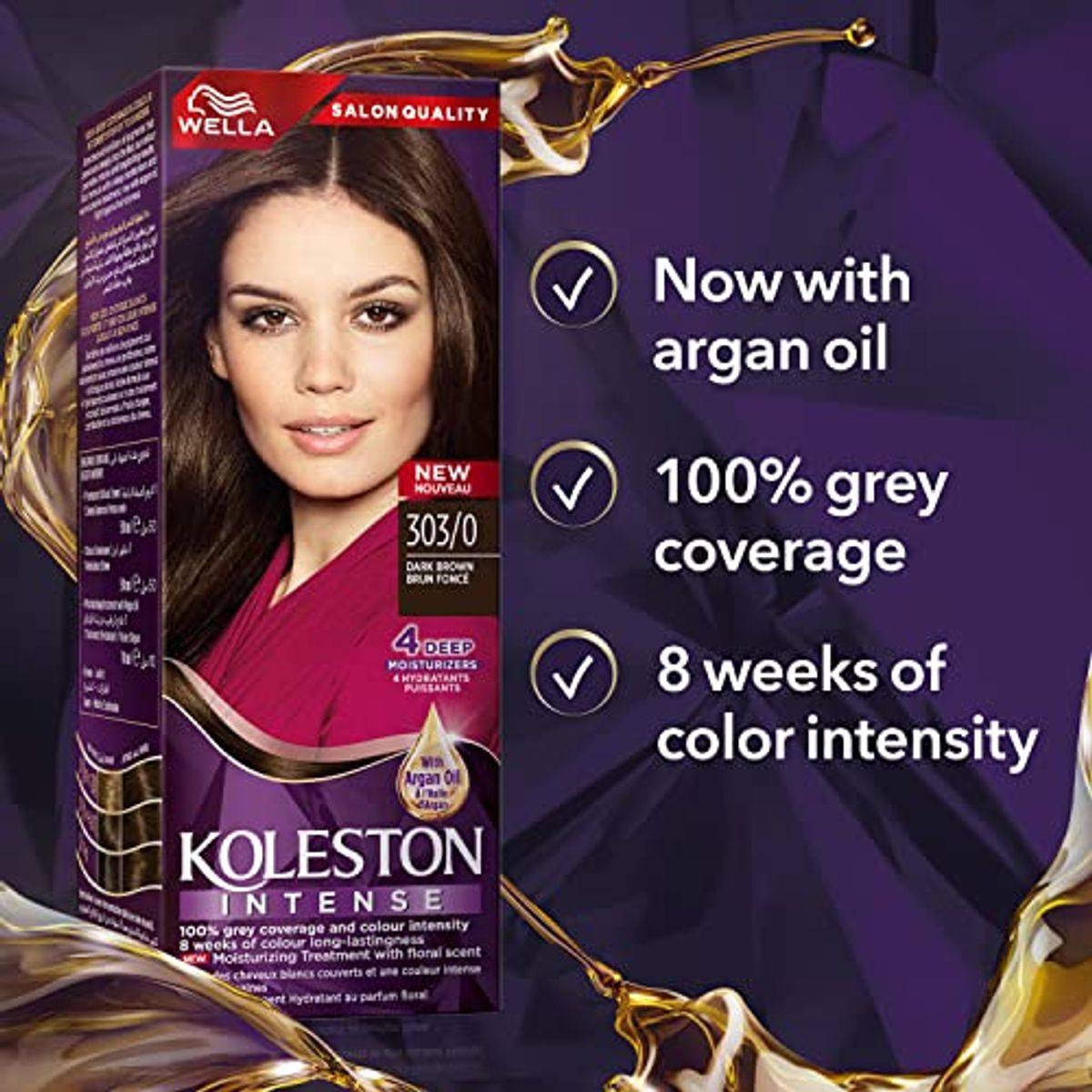 Wella Koleston Intense Hair Color 303/0 Dark Brown offers professional-quality hair color with 100% gray coverage and vibrant, long-lasting results. Enriched with argan oil and deep moisturizers, it nourishes and hydrates hair, leaving it shiny and healthy. Easy to apply at home, it provides a salon-quality finish.