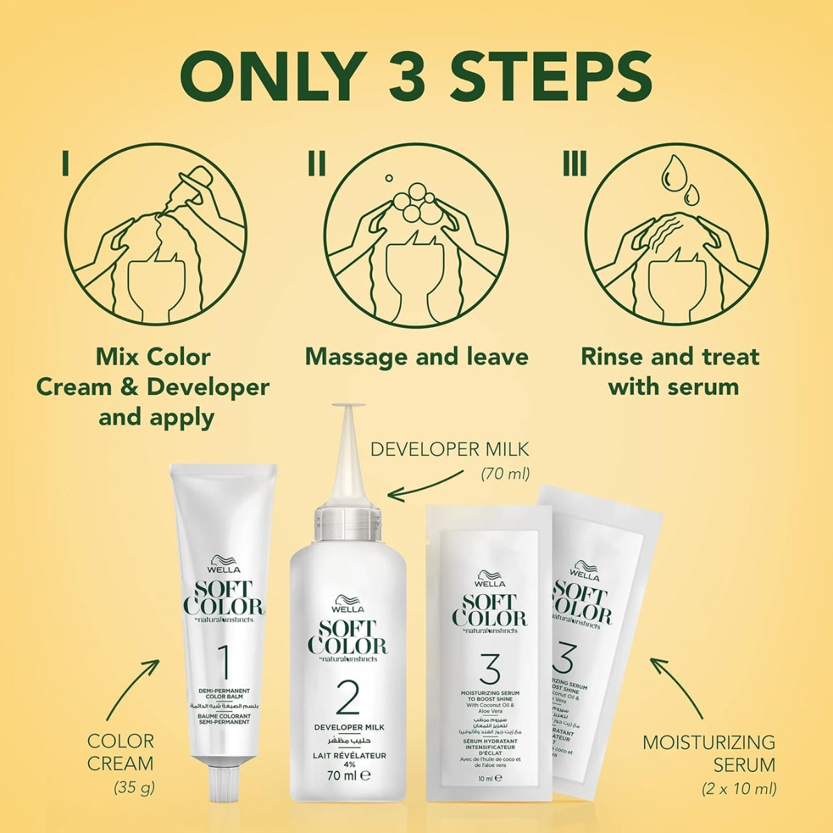 Discover Wella Soft Color, our semi permanent hair color! Soft Color has a gentle and highly caring formula. It's a no ammonia hair color with 99 percent natural ingredients - shea butter, coconut oil, alea vera - your hair is visibly healthy: Incredibly soft and shiny with 92 percent less hair breakage. Your hair color is radiant for up to 28 washes and your greys are optimally covered. Appreciate your coloring ritual with delicate floral fragrance in 20 minutes only. Soft Color is a dermatologically tested and vegan hair dye with a certified recyclable packaging! Soft to your hair, soft to the planet.