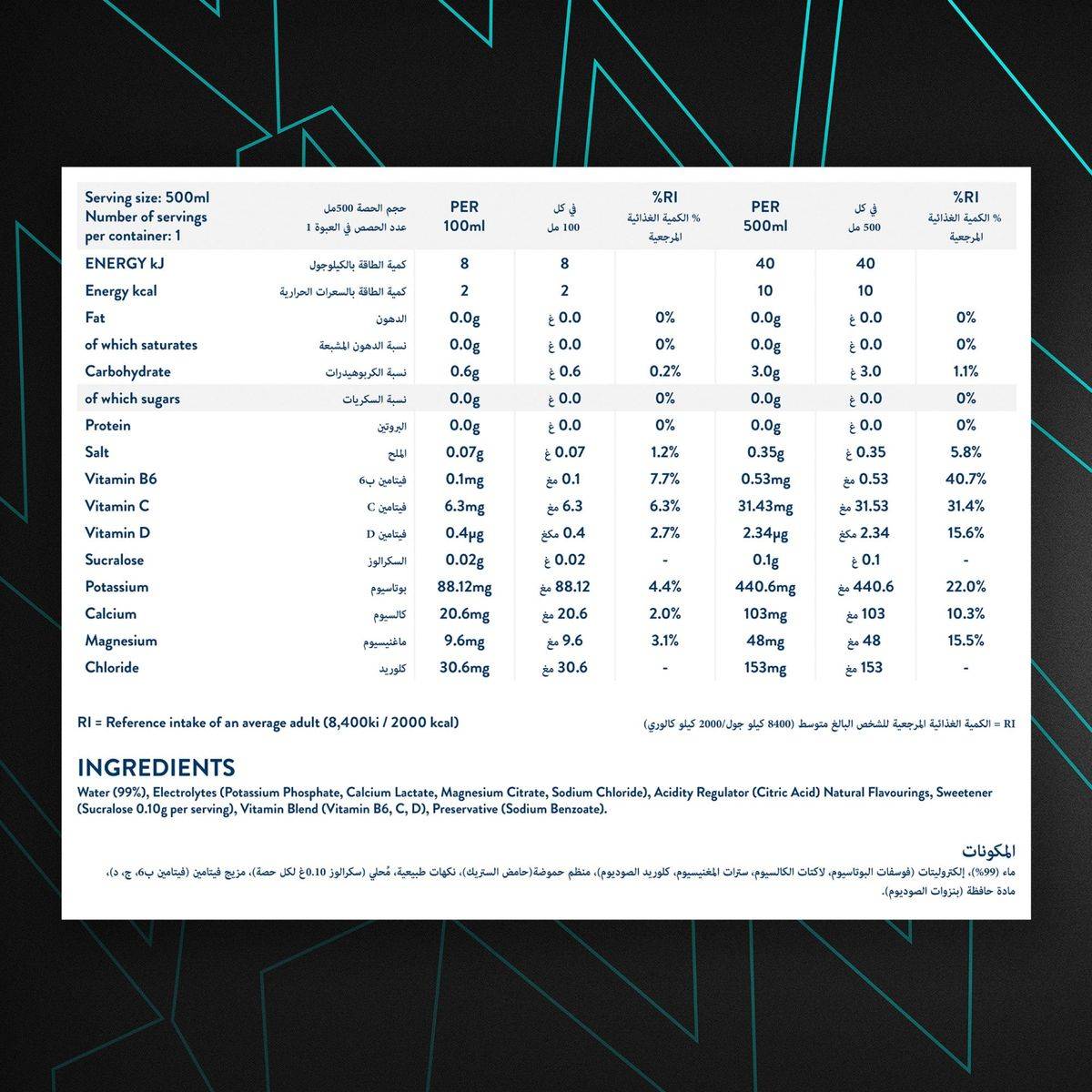 Water (99%), Electrolytes (Potassium Phosphate, Calcium Lactate, Magnesium Citrate, Sodium Chloride), Acidity Regulator (Citric Acid), Natural Flavourings, Sweetener (Sucralose 0.10g per serving), Vitamin Blend (Vitamin B6, C, D), Preservative (Sodium Benzoate).