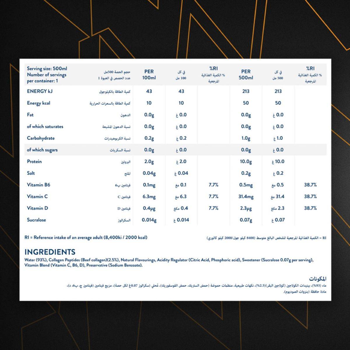 Water (93%), Collagen Peptides (Beef collagen) (2.5%), Natural Flavourings, Acidity Regulator (Citric Acid, Phosphoric acid), Sweetener (Sucralose 0.07g per serving), Vitamin Blend (Vitamin C, B6, D), Preservative (Sodium Benzoate).