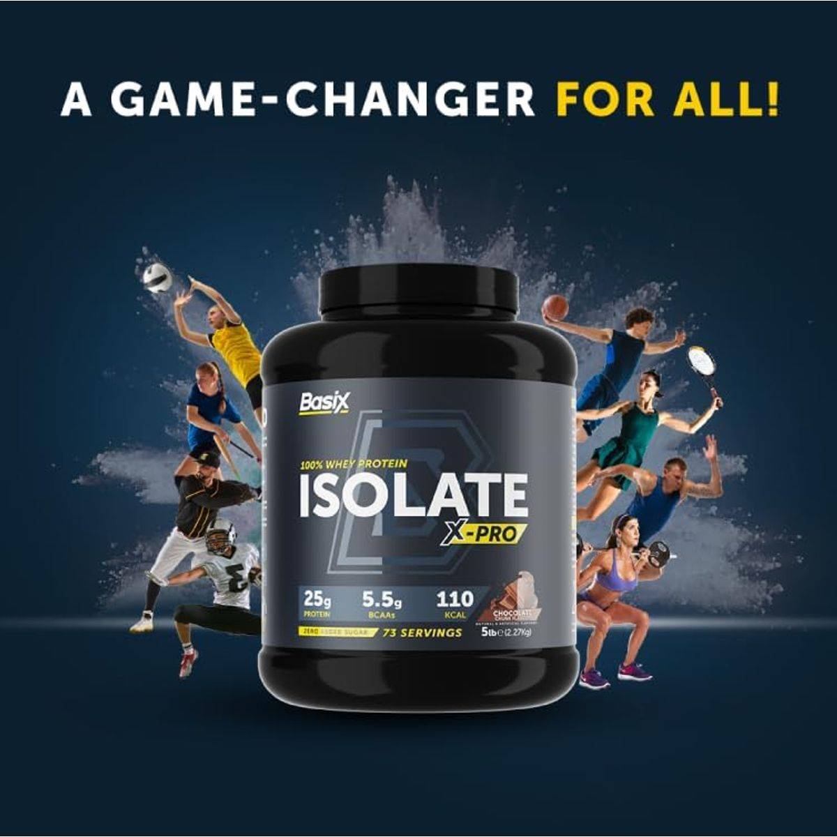 Basix Whey Protein Isolate XPRO Chocolate is a premium protein supplement offering 25g of protein per serving with zero added sugar. Designed for fitness enthusiasts, it supports muscle recovery and growth. With 73 servings per container, it's ideal for daily use post-workout.