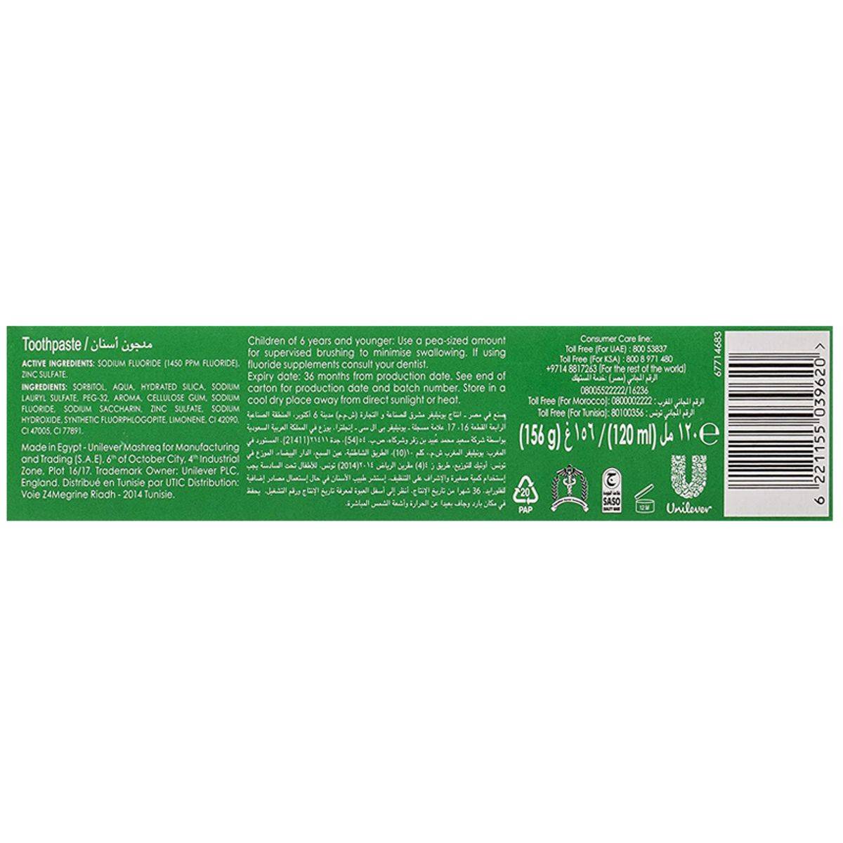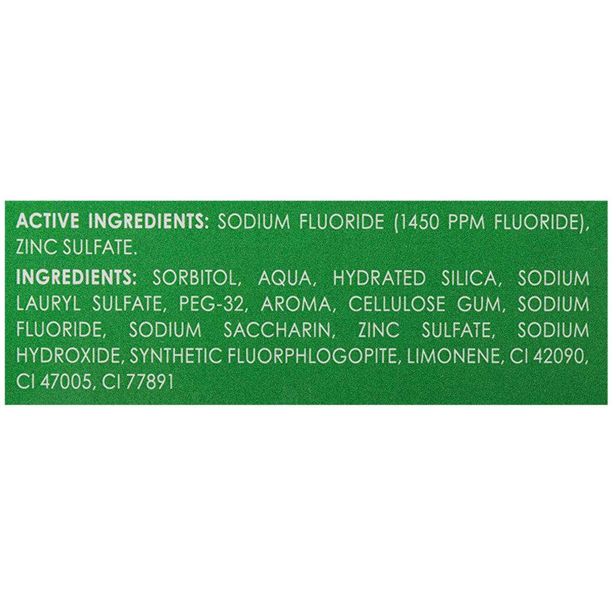 Sodium Fluoride (1450 ppm fluoride), Zinc Sulfate, Sorbitol, Aqua, Hydrated Silica, Sodium Lauryl Sulfate, PEG-32, Aroma, Cellulose Gum, Sodium Saccharin, Sodium Hydroxide, Synthetic Fluorphlogopite, Limonene, CI 42090, CI 47005, CI 77891.