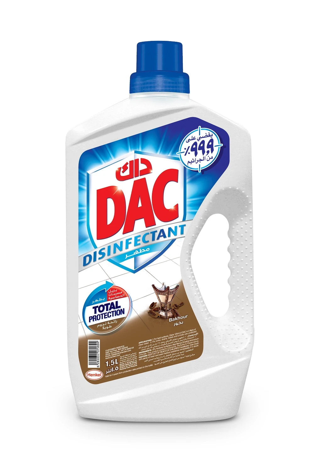 Dac Disinfectant Bakhour 1.5L is a powerful cleaning solution that eliminates 99% of germs. Its long-lasting fragrance ensures a fresh and clean environment. Ideal for hard surfaces, sinks, drains, toilets, and urinals. Perfect for maintaining a hygienic home.