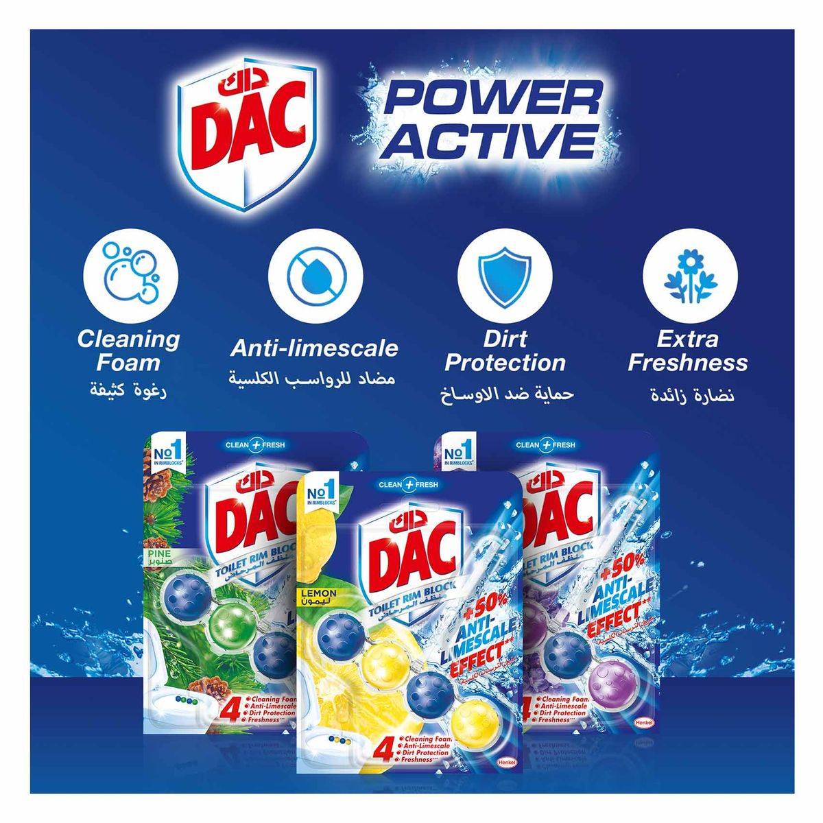 Dac Toilet Rim Block Lavender 50g keeps your toilet fresh and clean with its 4-function formula: cleaning foam, anti-limescale, dirt protection, and extra freshness. Easy to use, just hang it under the toilet rim for continuous freshness.