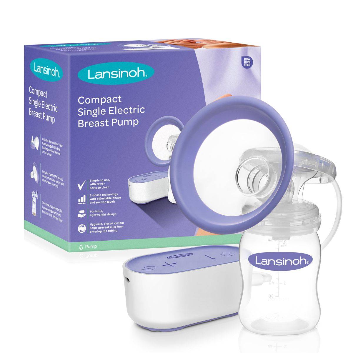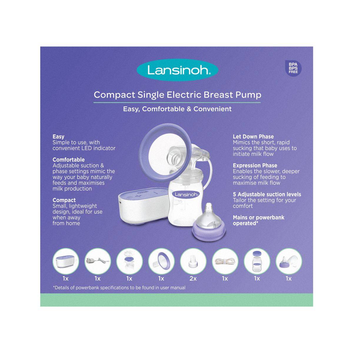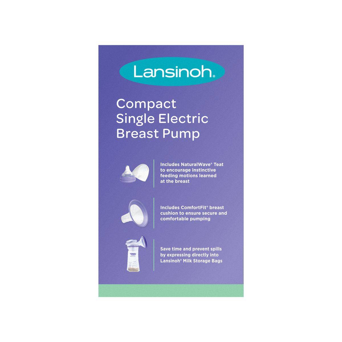 The Lansinoh Compact Single Electric Breast Pump is designed for convenience and portability, featuring hospital-grade suction levels. It is lightweight, compact, and discreet, perfect for on-the-go use. The pump includes ComfortFit Silicone Breast Cushion for a secure and comfortable fit, and it is compatible with Lansinoh® Breastmilk Storage Bags to prevent spills.
