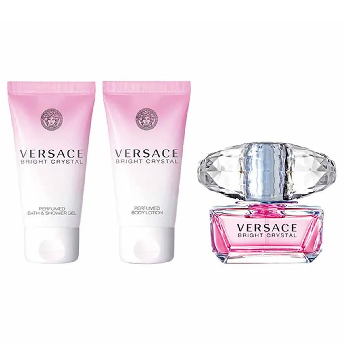 Versace Bright Crystal Set includes EDT, body lotion, and shower gel. Experience the luxurious scent and nourishing care for your skin.