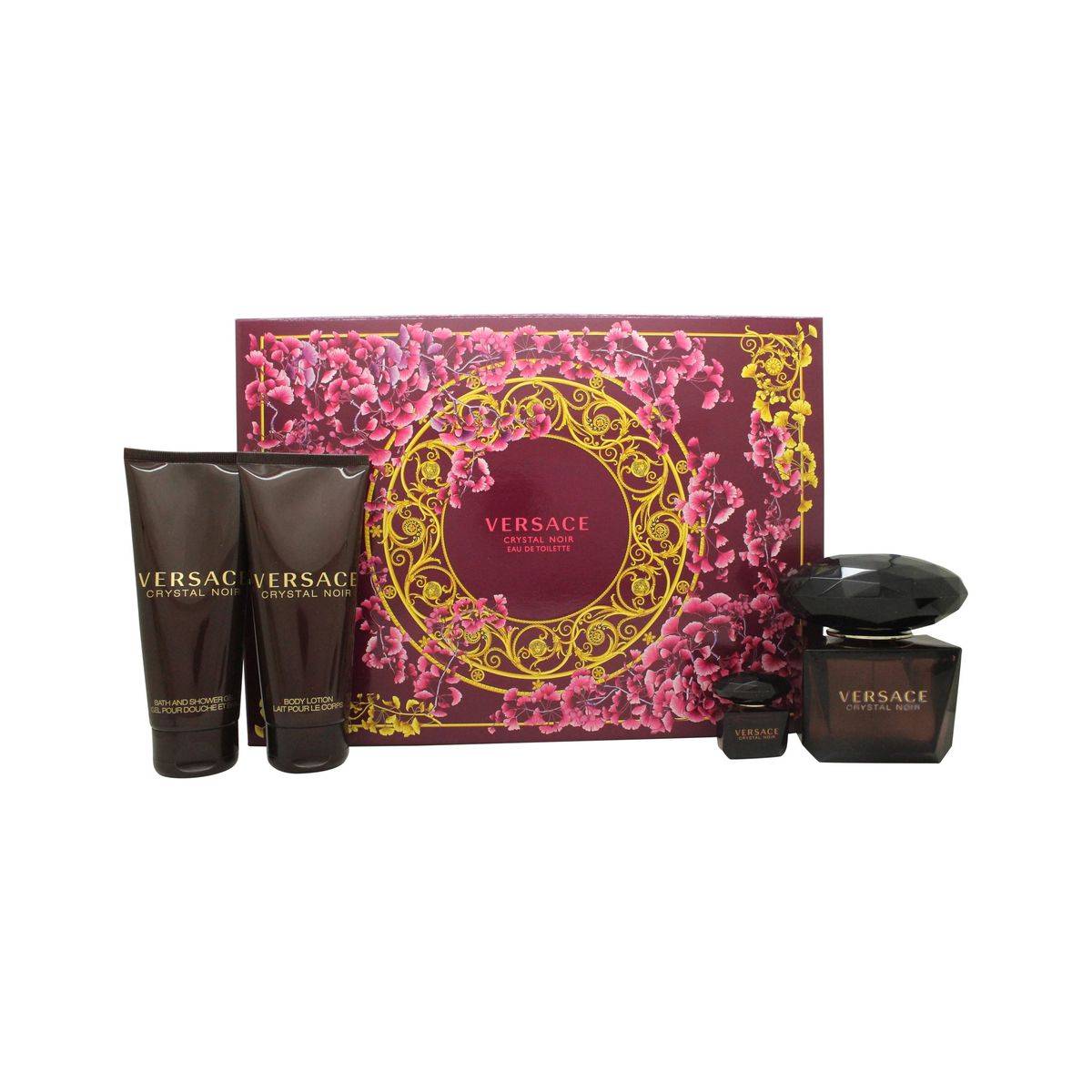 Versace Crystal Noir set includes EDT, body lotion, and bath & shower gel, offering a luxurious fragrance experience. Ideal for gifting or personal indulgence.