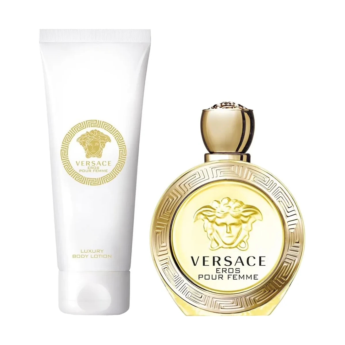 Versace Eros Pour Femme Set includes a luxurious Eau de Parfum and body lotion. The fragrance combines fresh citrus and floral notes with Sicilian lemon, jasmine, and sandalwood, perfect for daily wear or special occasions.
