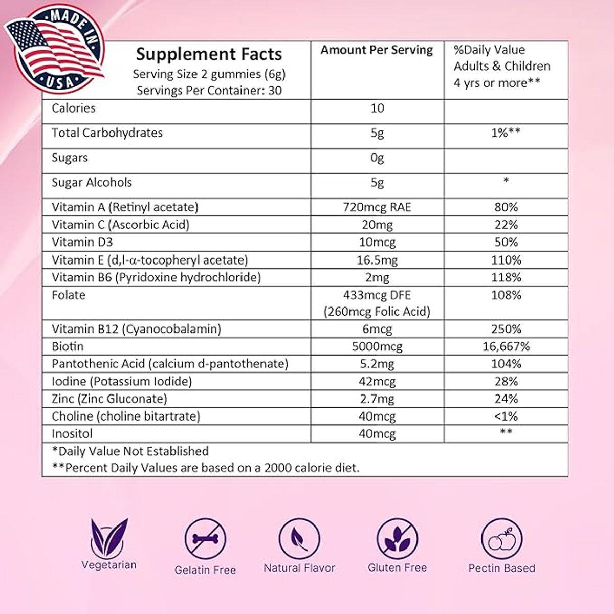 Vitamin A (Retinyl acetate), Vitamin C (Ascorbic Acid), Vitamin D3, Vitamin E (d,l-alpha-tocopheryl acetate), Vitamin B6 (Pyridoxine hydrochloride), Folate (260 mcg Folic Acid), Vitamin B12 (Cyanocobalamin), Biotin, Pantothenic Acid (calcium d-pantothenate), Iodine (Potassium Iodide), Zinc (Zinc Gluconate), Choline (choline bitartrate), Inositol, Vegetarian, Gelatin Free, Natural Flavor, Gluten Free, Pectin Based.